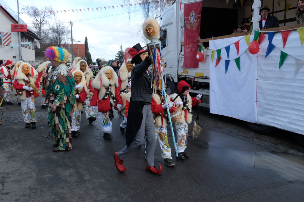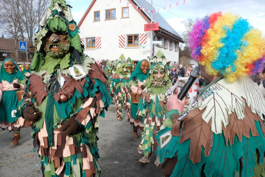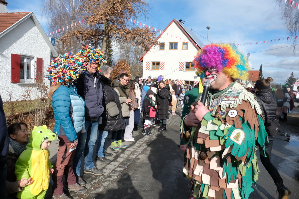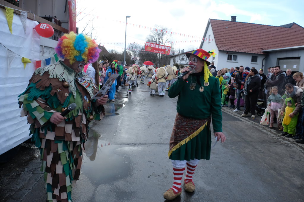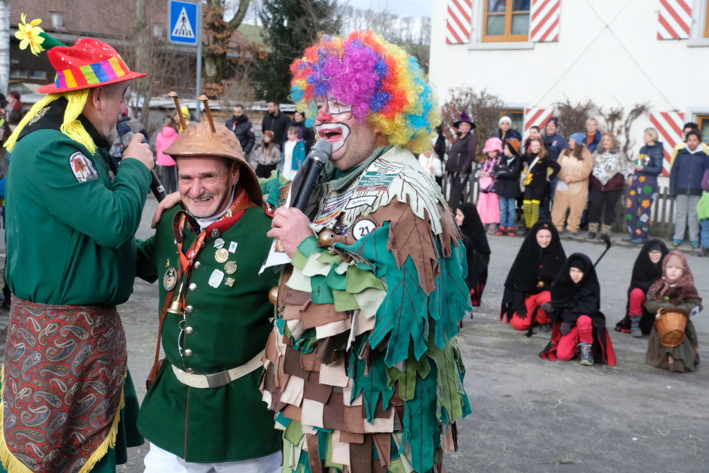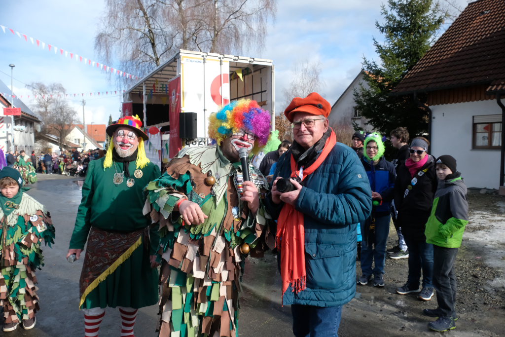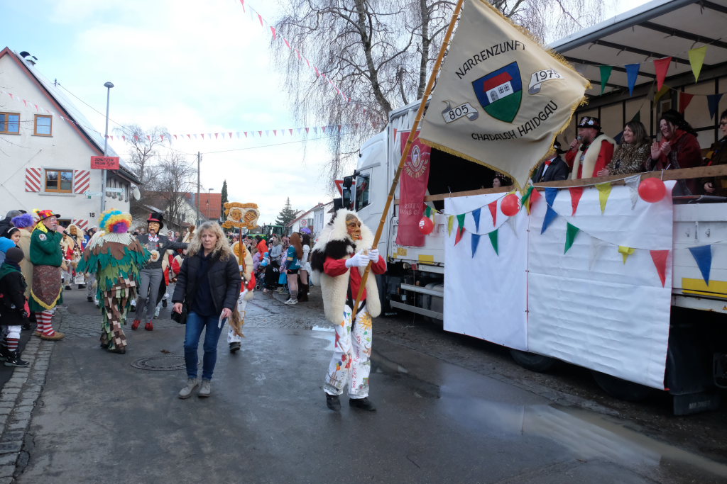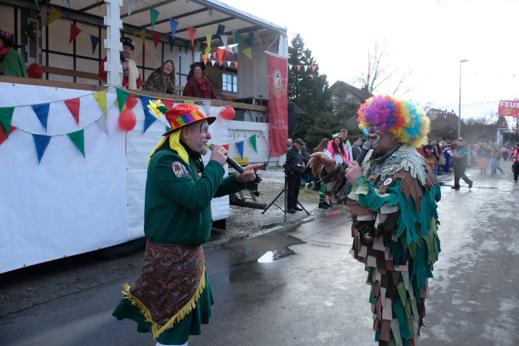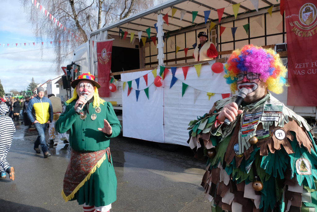 Haidgau – Beim diesjährigen Narrensprung haben die Verantwortlichen der Haidgauer Zunft bewusst die Bremse gezogen, nachdem beim Jubiläum im Vorjahr alle ANR-Zünfte eingeladen werden mussten. Mit 48 Umzugspositionen war er deutlich kürzer als im Vorjahr. Gleichgeblieben aber ist der hohe Unterhaltungswert, den Günther „Turbo“ Angele und Alex Wild – in diesem Jahr als Clowns getarnt – als Moderatoren und Ansagern den zahlreichen Besuchern und den Ehrengästen auf der zur Ehrentribüne umgestalteten LKW-Pritsche boten.