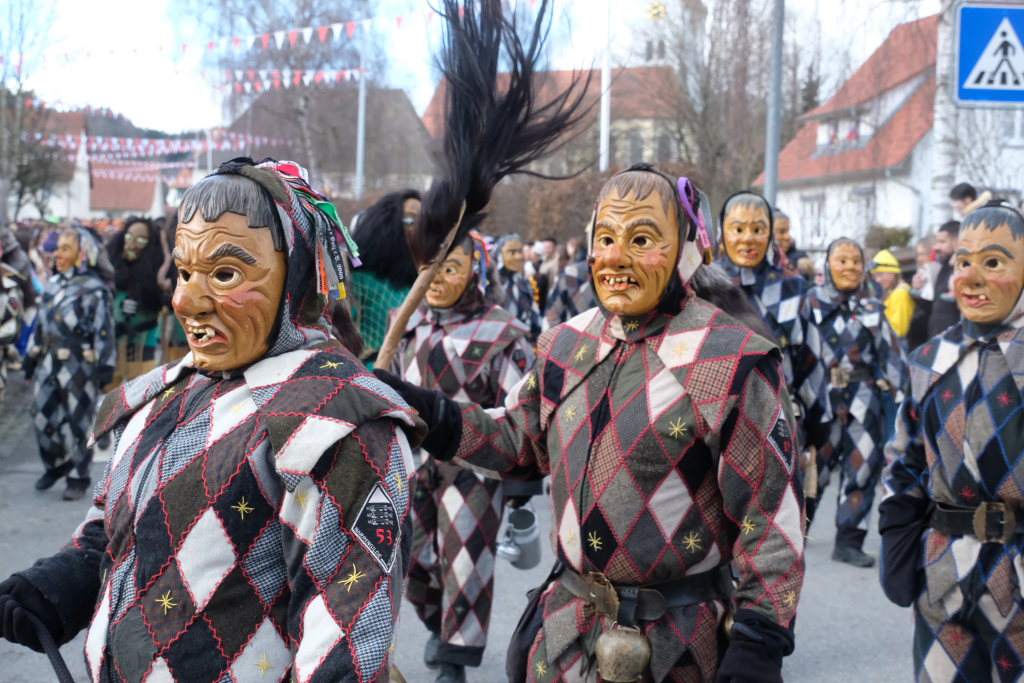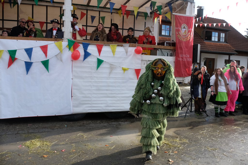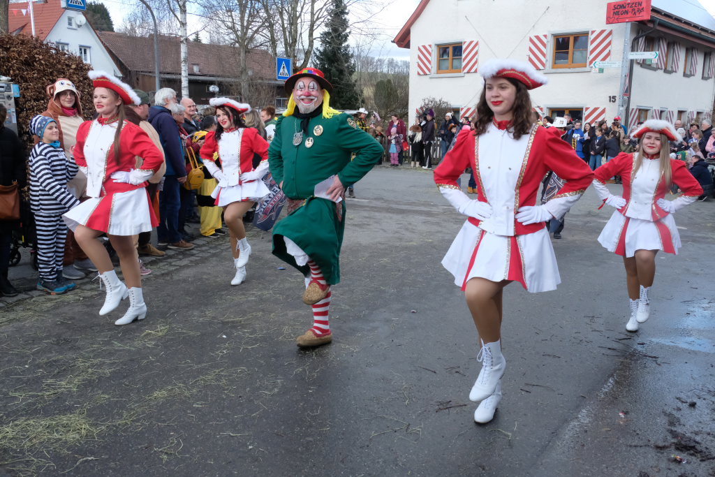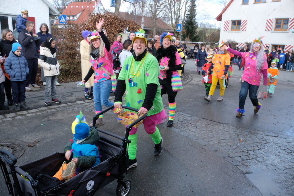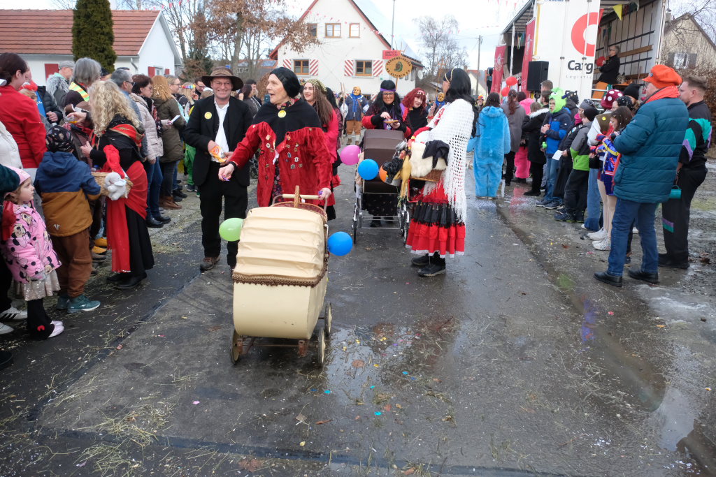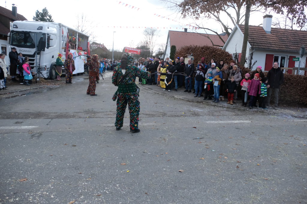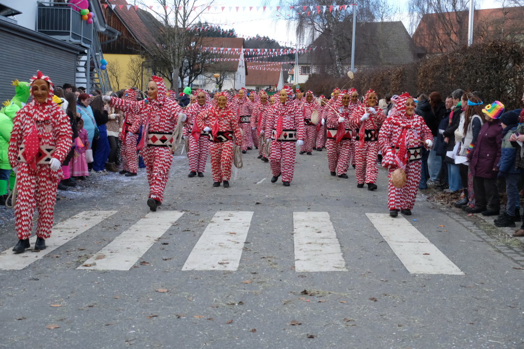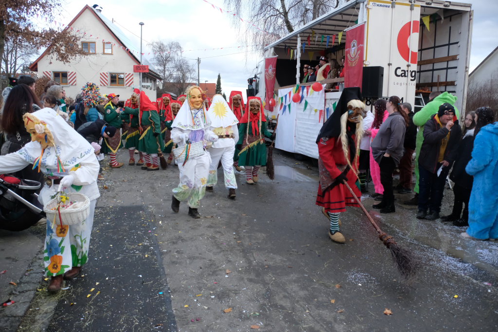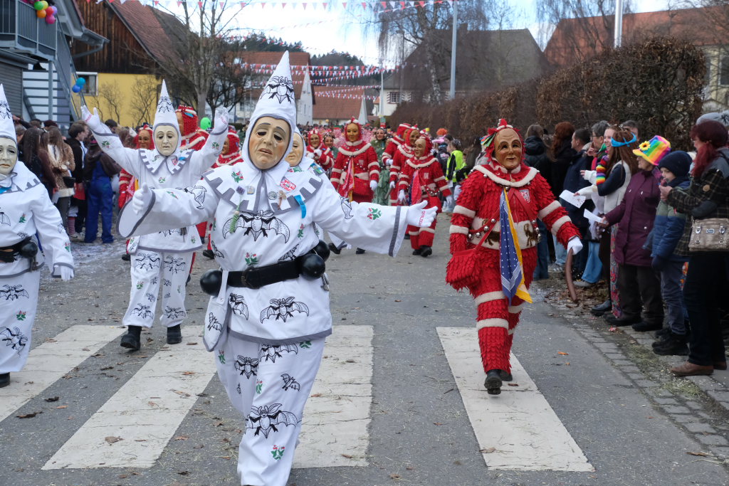 Haidgau – Beim diesjährigen Narrensprung haben die Verantwortlichen der Haidgauer Zunft bewusst die Bremse gezogen, nachdem beim Jubiläum im Vorjahr alle ANR-Zünfte eingeladen werden mussten. Mit 48 Umzugspositionen war er deutlich kürzer als im Vorjahr. Gleichgeblieben aber ist der hohe Unterhaltungswert, den Günther „Turbo“ Angele und Alex Wild – in diesem Jahr als Clowns getarnt – als Moderatoren und Ansagern den zahlreichen Besuchern und den Ehrengästen auf der zur Ehrentribüne umgestalteten LKW-Pritsche boten.