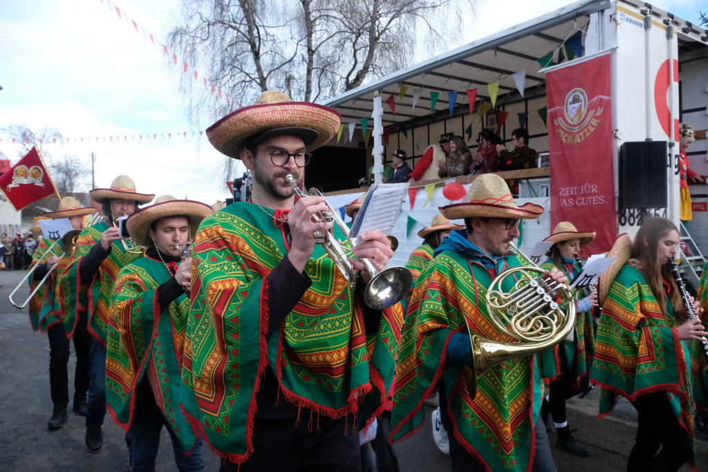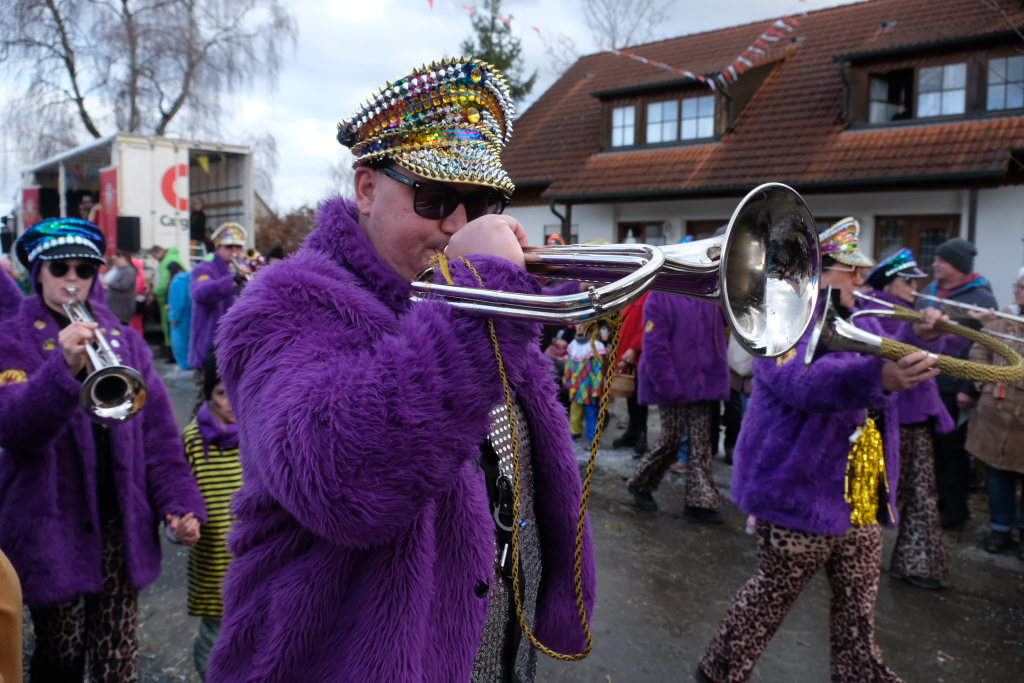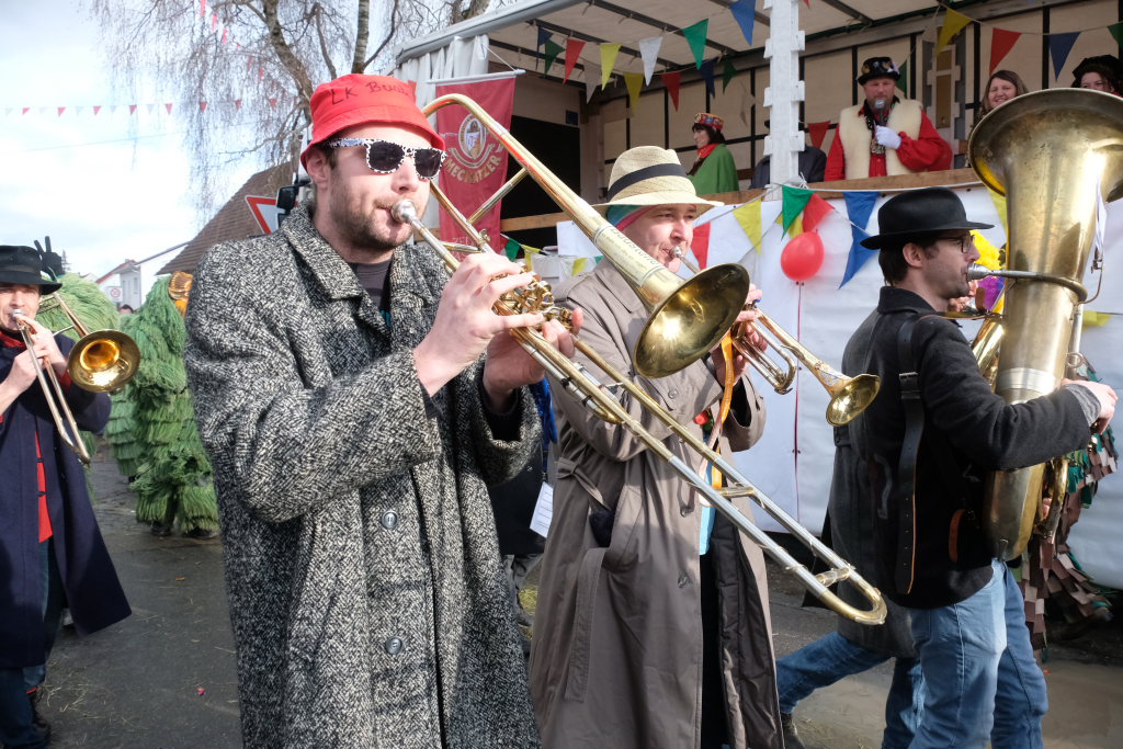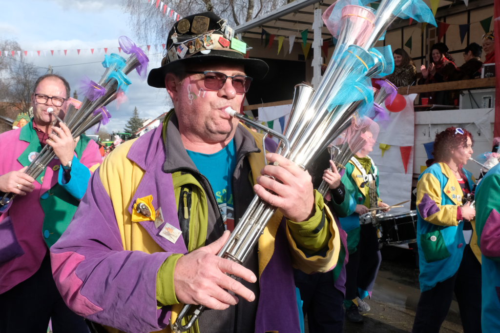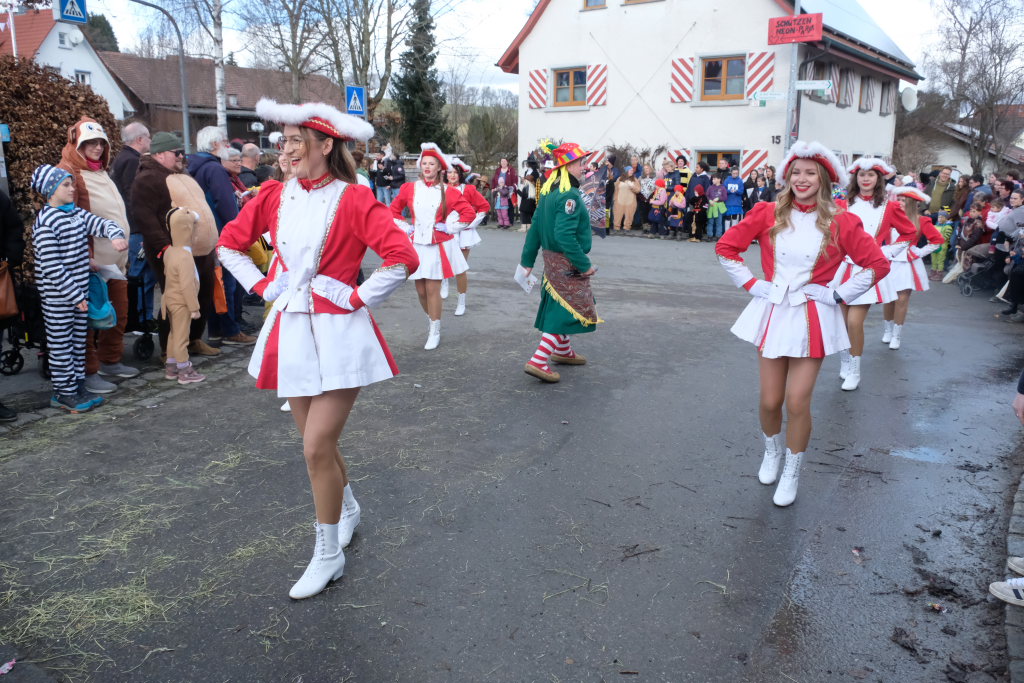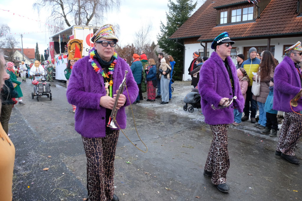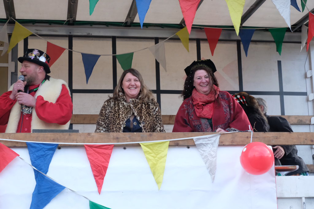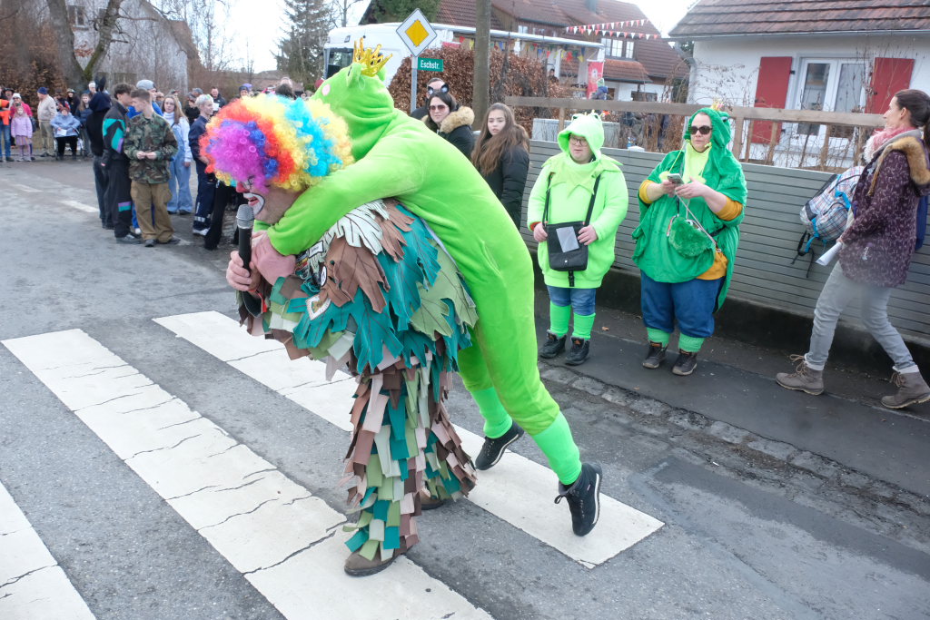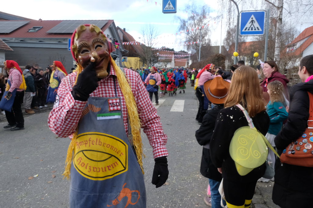 Haidgau – Beim diesjährigen Narrensprung haben die Verantwortlichen der Haidgauer Zunft bewusst die Bremse gezogen, nachdem beim Jubiläum im Vorjahr alle ANR-Zünfte eingeladen werden mussten. Mit 48 Umzugspositionen war er deutlich kürzer als im Vorjahr. Gleichgeblieben aber ist der hohe Unterhaltungswert, den Günther „Turbo“ Angele und Alex Wild – in diesem Jahr als Clowns getarnt – als Moderatoren und Ansagern den zahlreichen Besuchern und den Ehrengästen auf der zur Ehrentribüne umgestalteten LKW-Pritsche boten.