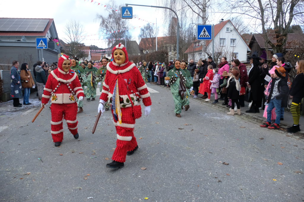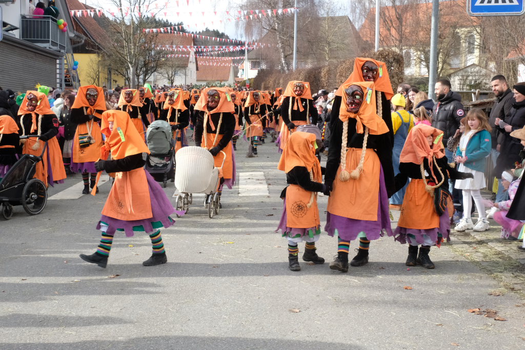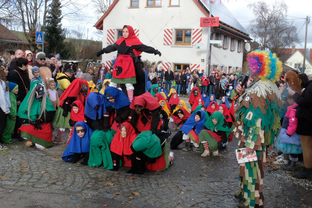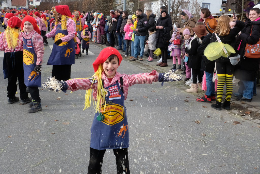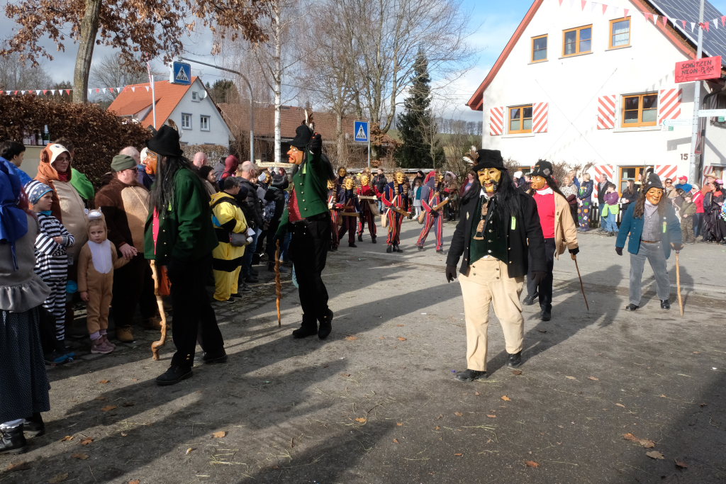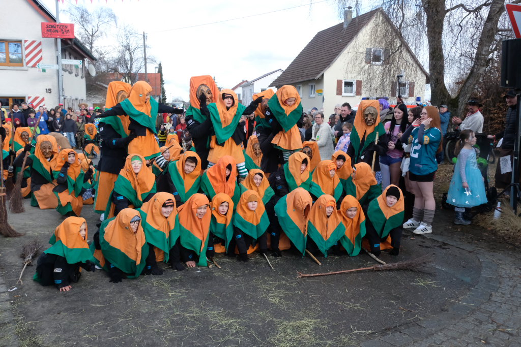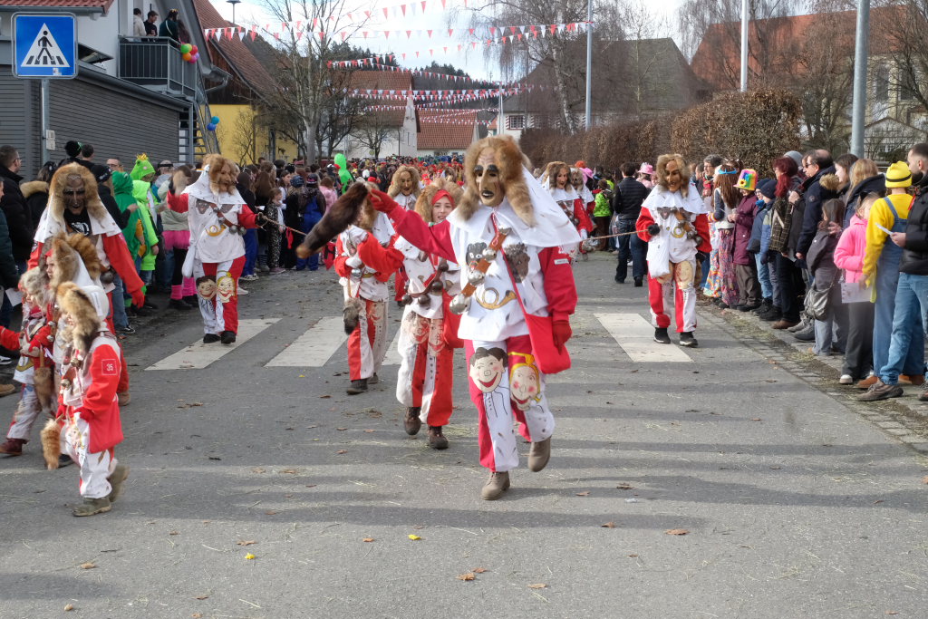 Pünktlich um 14.00 Uhr eröffnete die Musikkapelle Haidgau den Narrensprung gemeinsam mit Fahnenabordnung, Narrensamen, sowie Wachtmeister und Fasnetslader, den beiden besonderen Einzelfiguren der Haidgauer Zunft. Und noch eine weitere Gruppe aus der Ortschaft folgte ihnen: Die Kindergarten-Kinder von St. Nikolaus, deren Narrenruf bezeichnenderweise „Schrei-Hälse“ lautete.