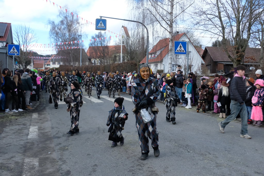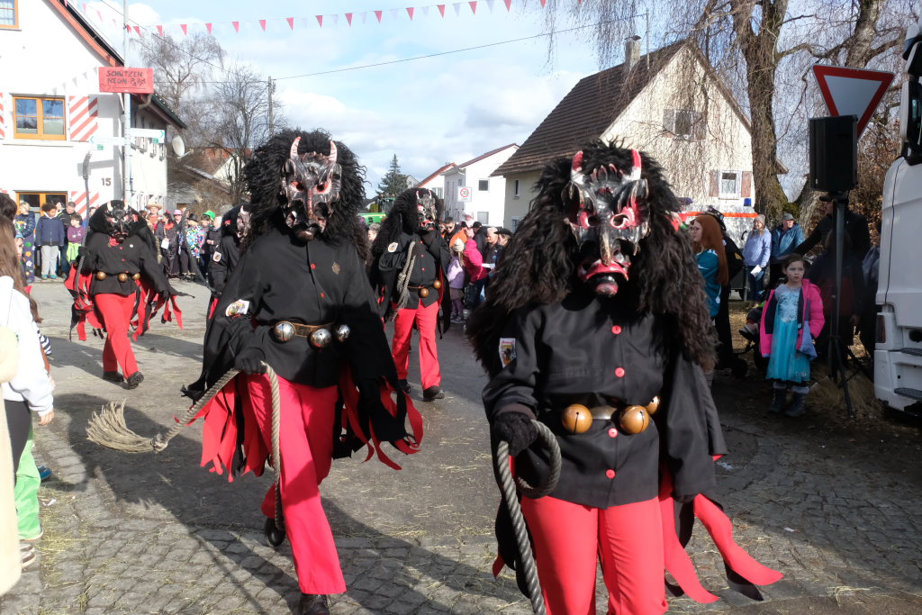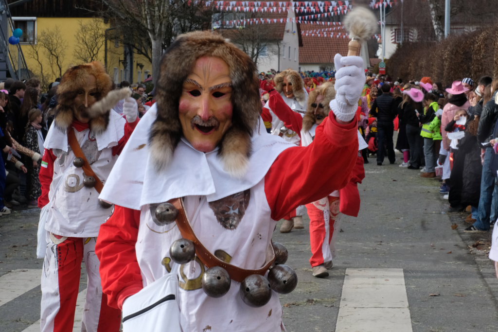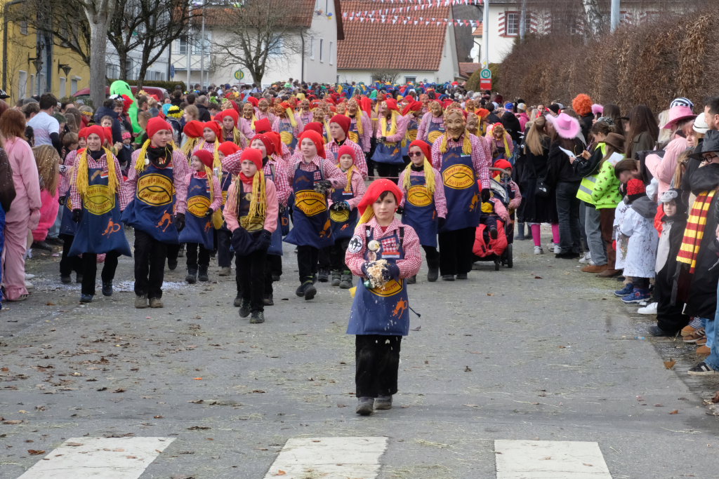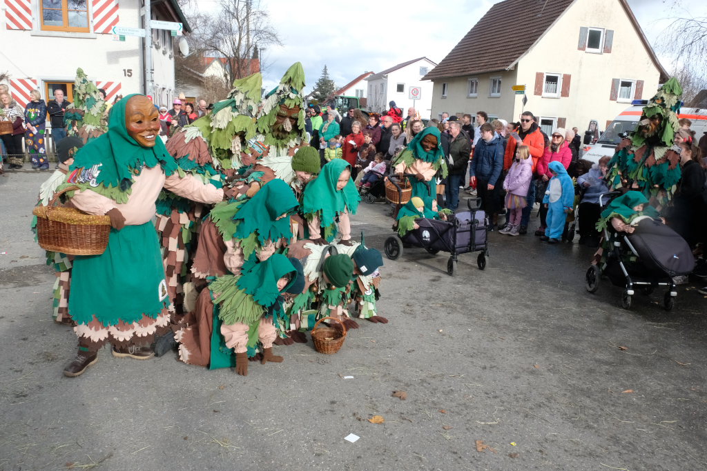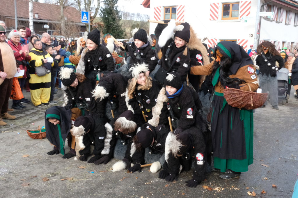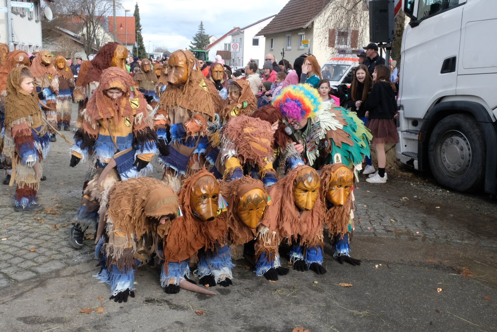 Pünktlich um 14.00 Uhr eröffnete die Musikkapelle Haidgau den Narrensprung gemeinsam mit Fahnenabordnung, Narrensamen, sowie Wachtmeister und Fasnetslader, den beiden besonderen Einzelfiguren der Haidgauer Zunft. Und noch eine weitere Gruppe aus der Ortschaft folgte ihnen: Die Kindergarten-Kinder von St. Nikolaus, deren Narrenruf bezeichnenderweise „Schrei-Hälse“ lautete.