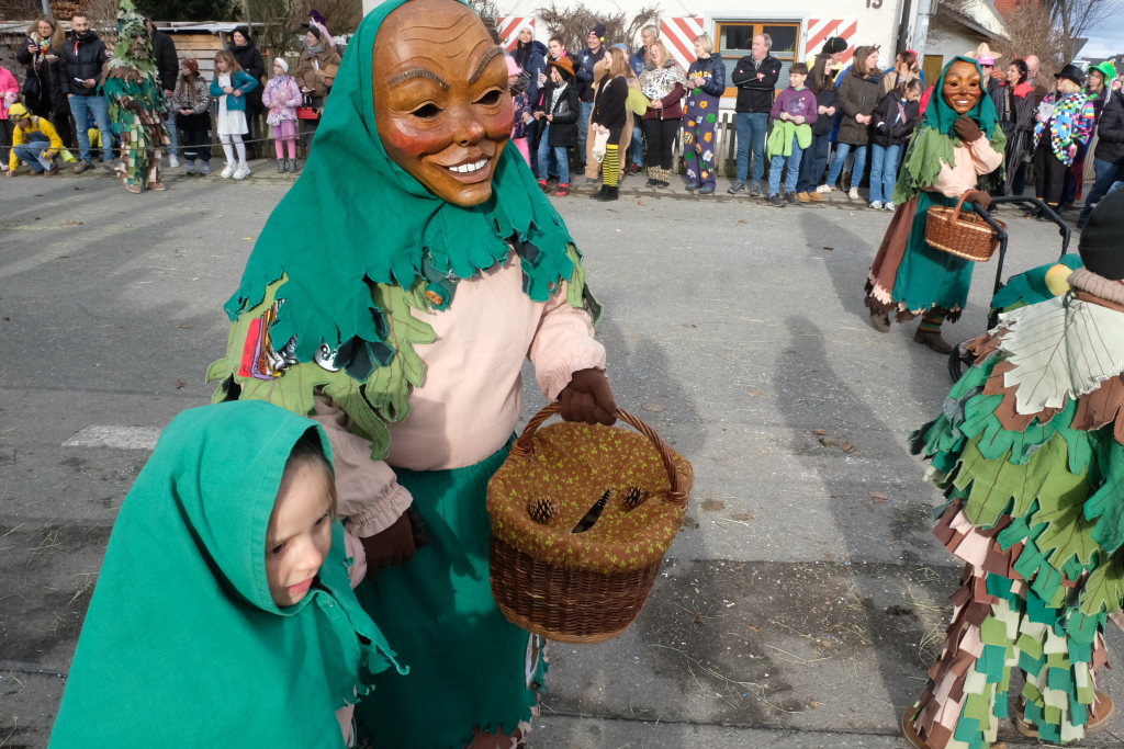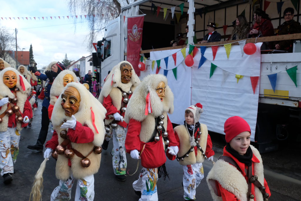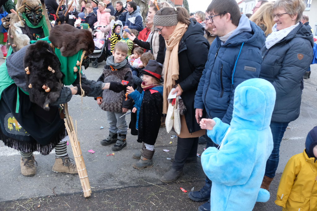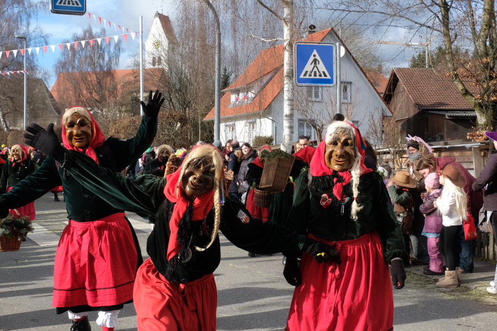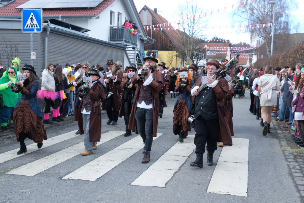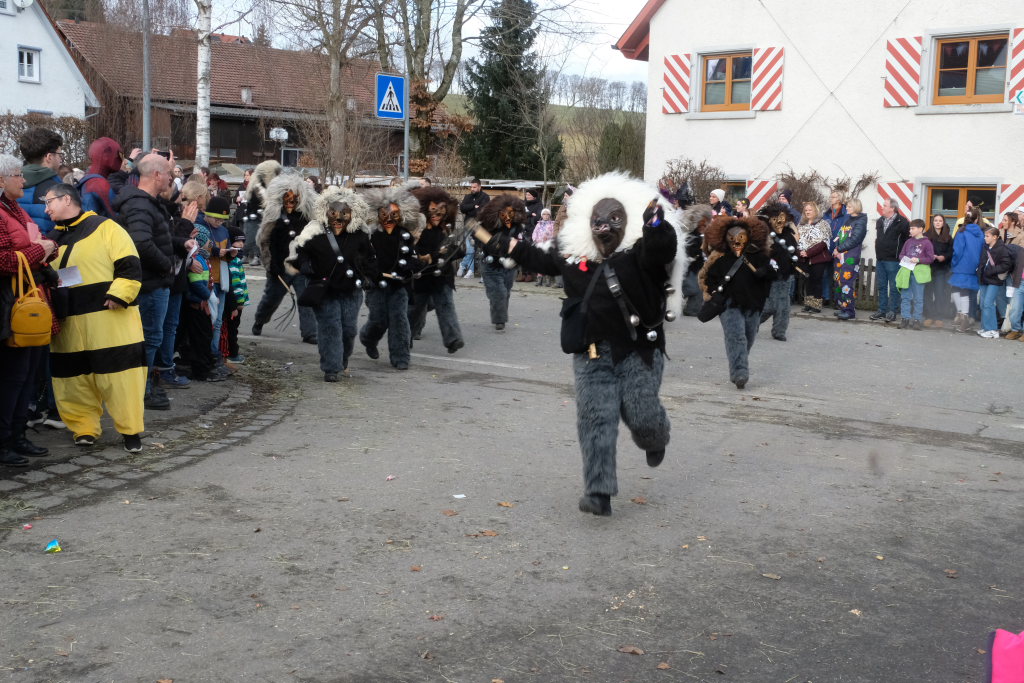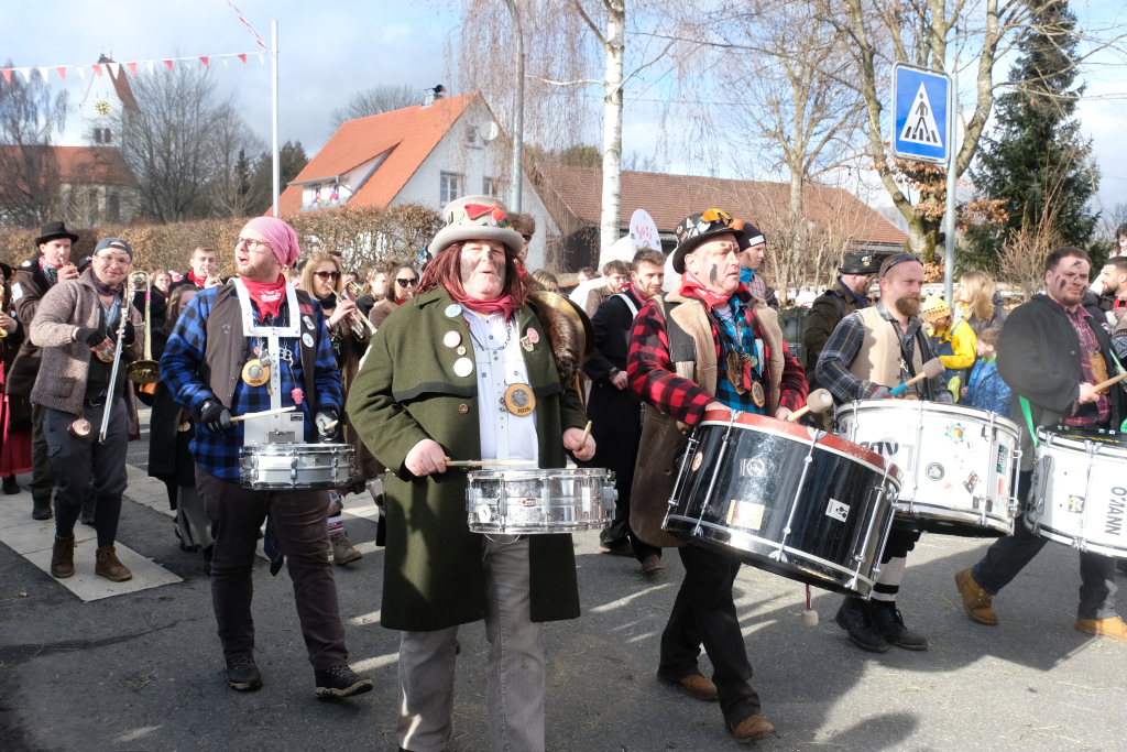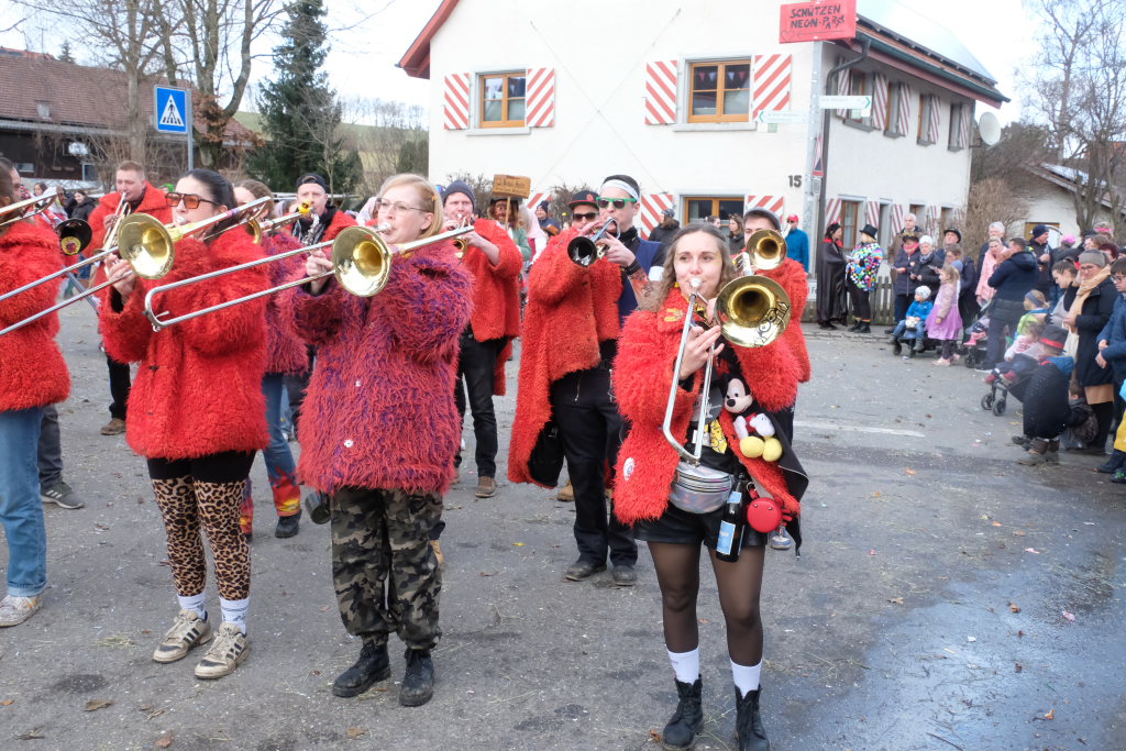 Pünktlich um 14.00 Uhr eröffnete die Musikkapelle Haidgau den Narrensprung gemeinsam mit Fahnenabordnung, Narrensamen, sowie Wachtmeister und Fasnetslader, den beiden besonderen Einzelfiguren der Haidgauer Zunft. Und noch eine weitere Gruppe aus der Ortschaft folgte ihnen: Die Kindergarten-Kinder von St. Nikolaus, deren Narrenruf bezeichnenderweise „Schrei-Hälse“ lautete.