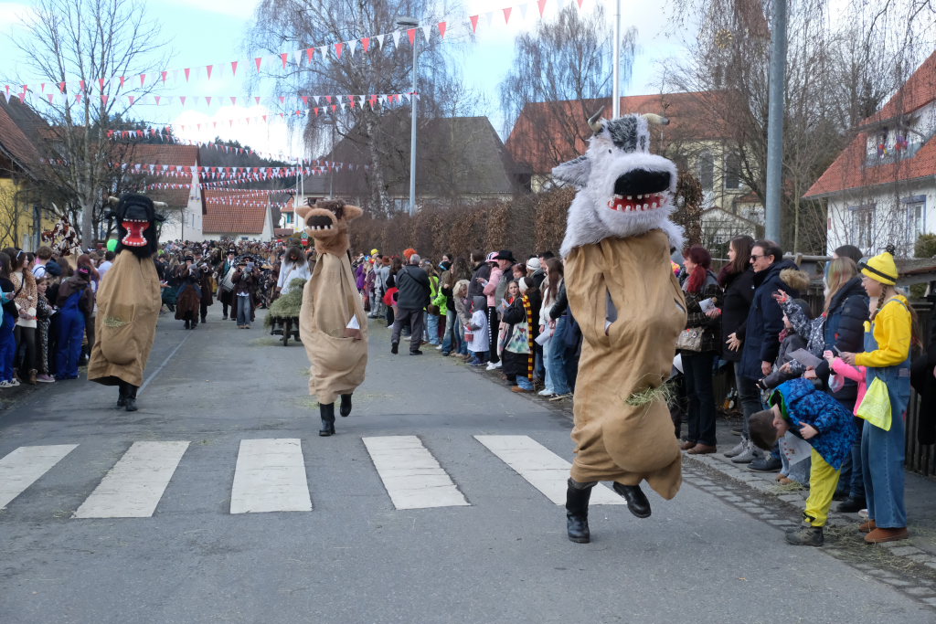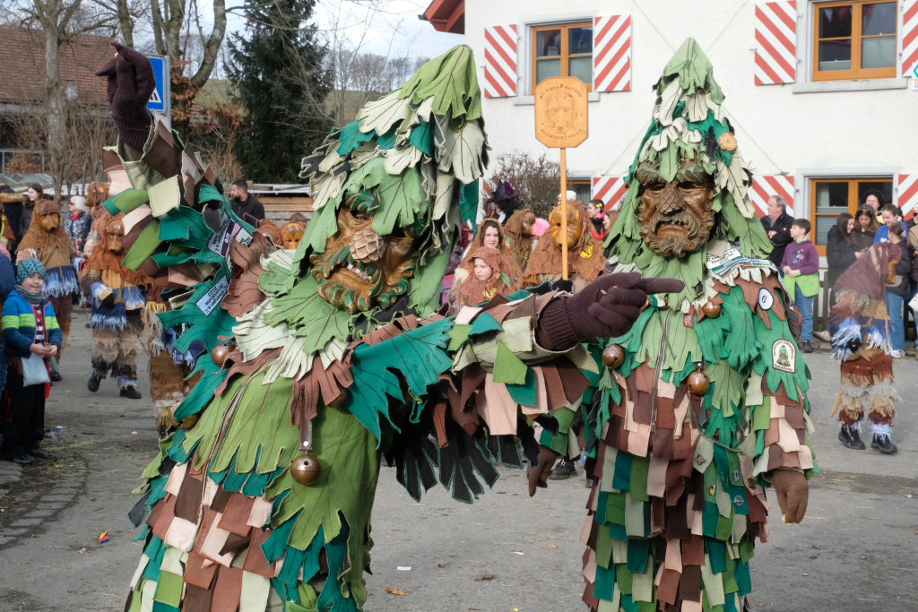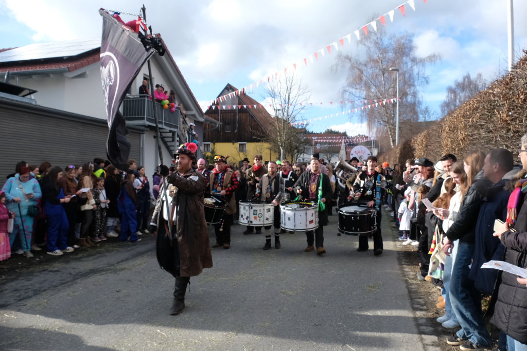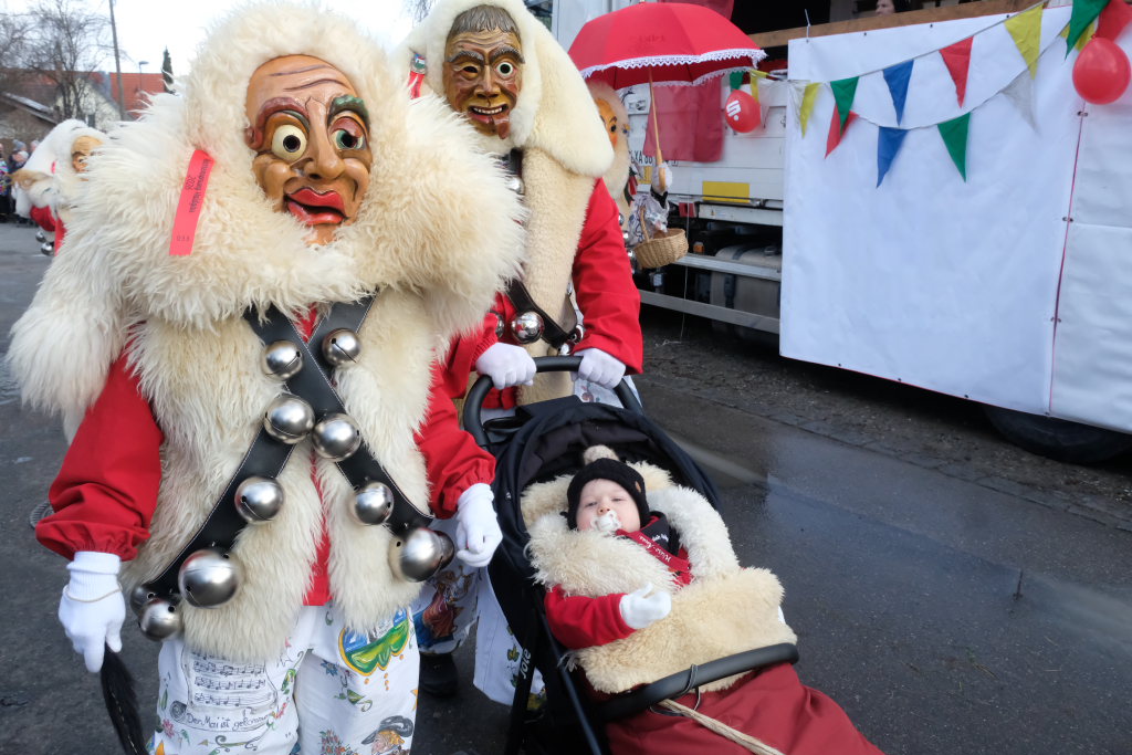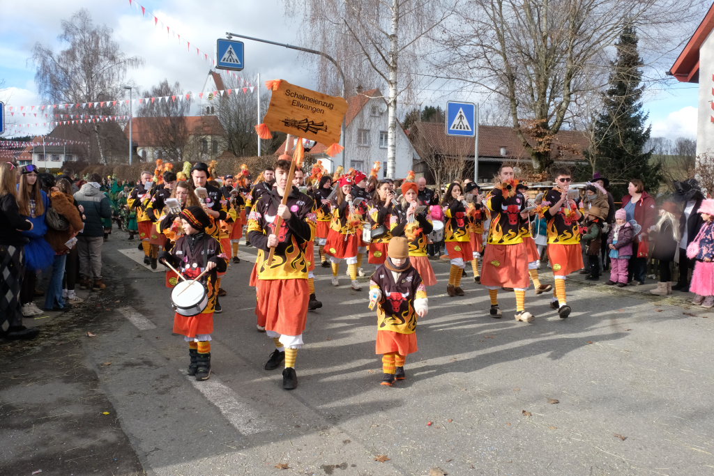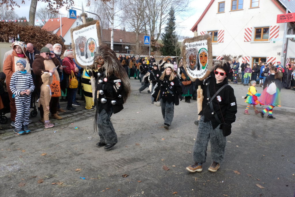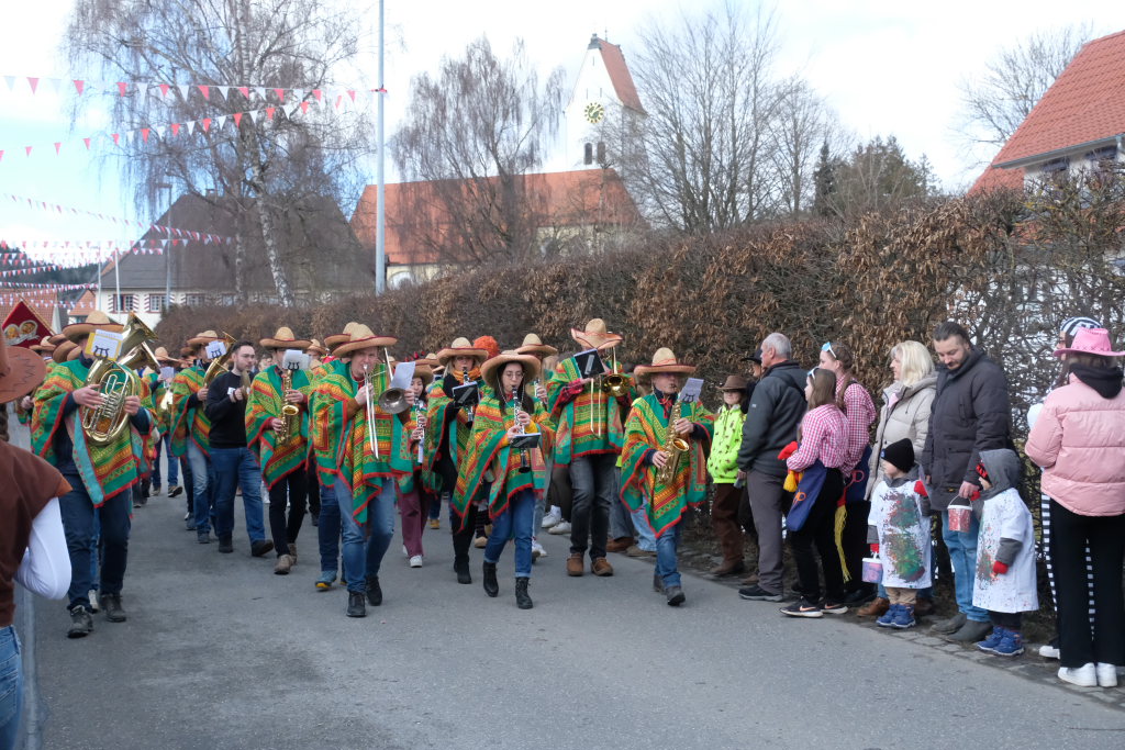Pünktlich um 14.00 Uhr eröffnete die Musikkapelle Haidgau den Narrensprung gemeinsam mit Fahnenabordnung, Narrensamen, sowie Wachtmeister und Fasnetslader, den beiden besonderen Einzelfiguren der Haidgauer Zunft. Und noch eine weitere Gruppe aus der Ortschaft folgte ihnen: Die Kindergarten-Kinder von St. Nikolaus, deren Narrenruf bezeichnenderweise „Schrei-Hälse“ lautete.