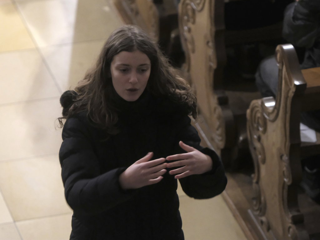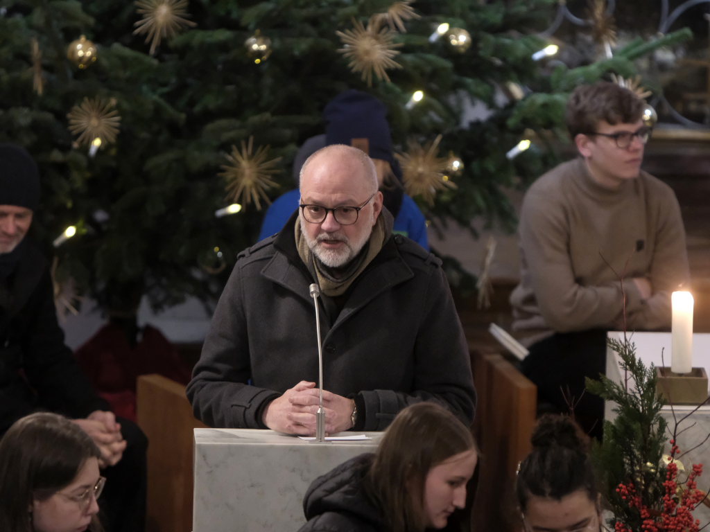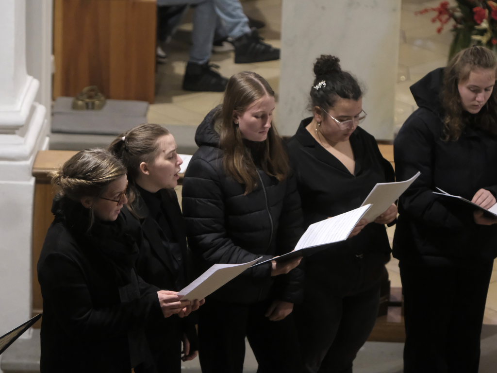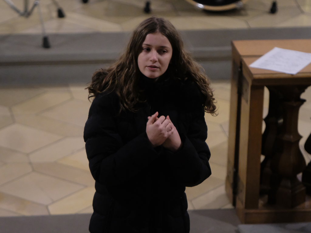 Nach „Somewhere over the Rainbow“ aus dem Film „Der Zauberer von Oz“, ebenfalls von der Schulband gespielt, schritt Corinna Föhr als Rezitatorin von Texten aus dem Zyklus „Concerto di voci“ von Carl Orff, unter den pochenden Klängen der großen, von Hannah Gräber geschlagenen, Trommel durch den Mittelgang der Kirche nach vorne. „Alles hat seine Zeit, jedes Ereignis, alles auf der Welt hat seine Zeit, Geborenwerden und Sterben … Töten und Heilen … Weinen und Lachen … Suchen und Finden … Lieben und Hassen, Krieg und Frieden,“ heißt es darin unter anderem. Diese auf den biblischen Texten des Buches Prediger basierende Texte nahm anschließend der an beiden Seiten der Kirche postierte Chor bei seinem Sprechgesang mit auf. Bei den Textrezitationen des Chores beteiligt waren: Mia Haser, Neviah Häfele, Feline Miller, Leonie Geiss, Hannah Geyer, Elisa Sauter, Corinna Föhr, Marian Eiden, Severin Vogt, Kilian Binzer, Vitus Vogt, Timo König, Alisa Gentner und Jonna Radke.