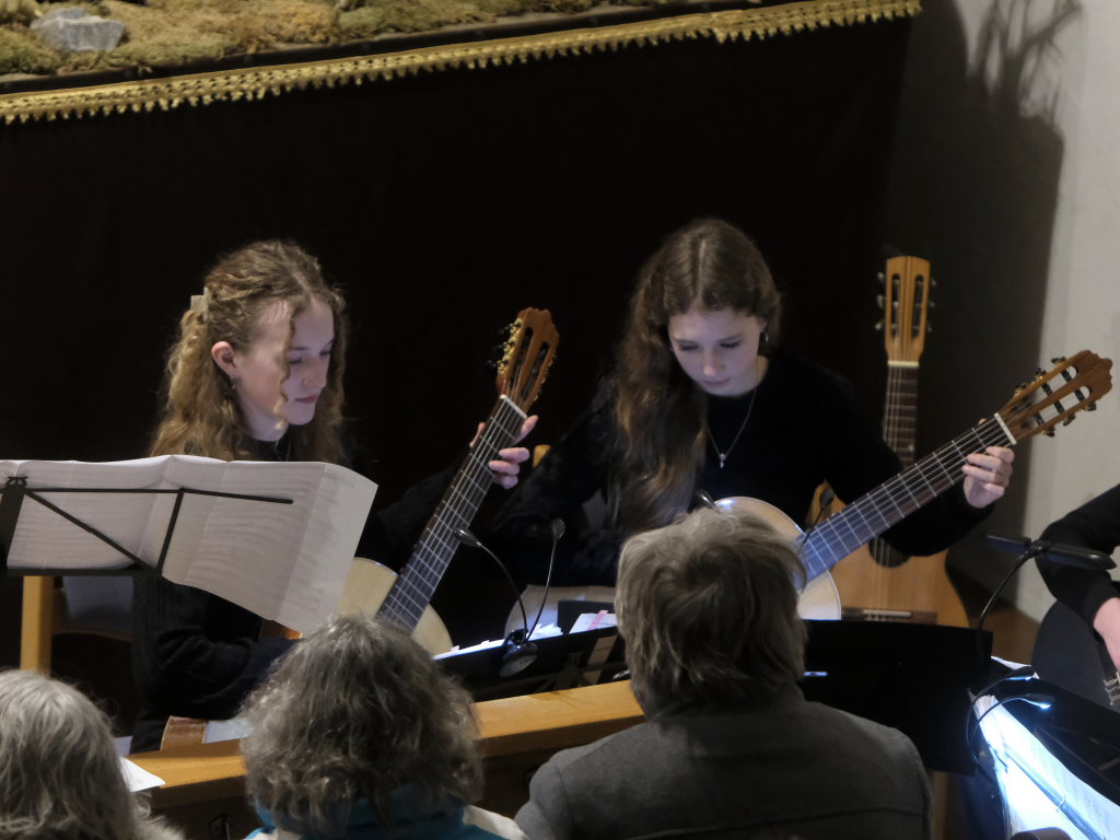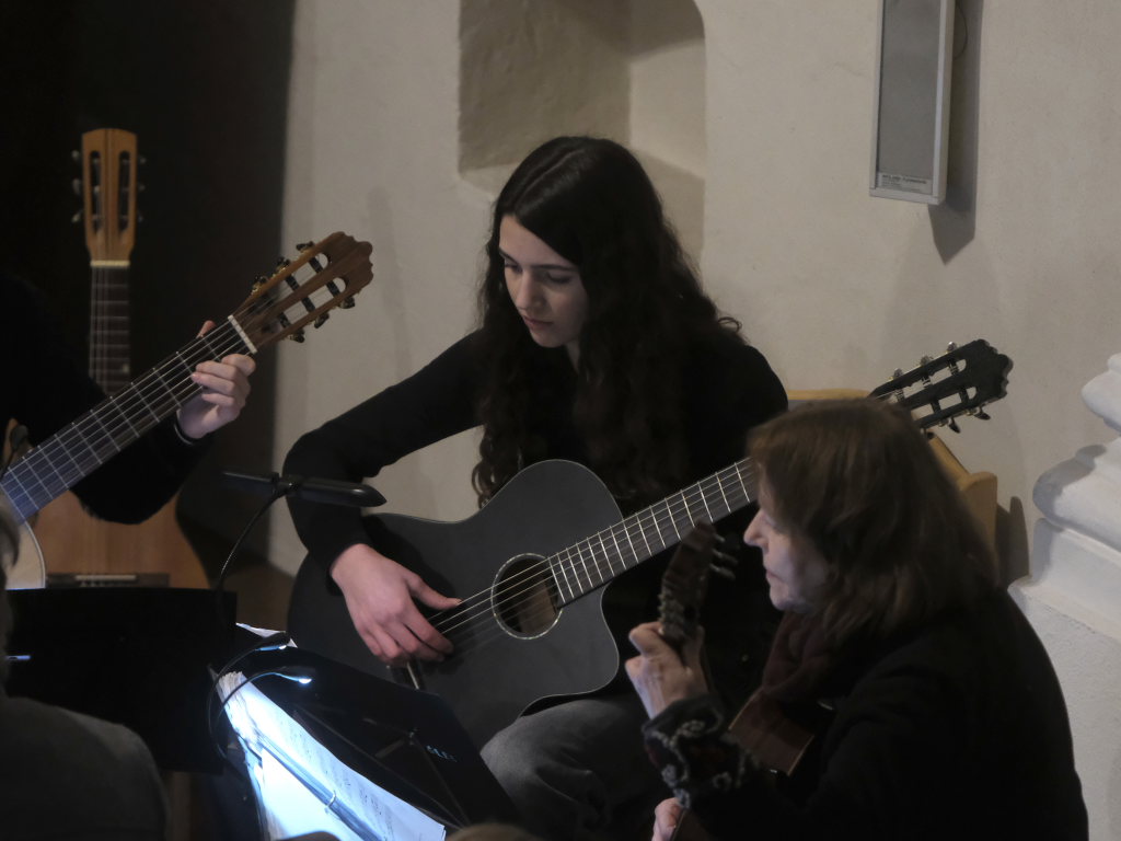 Noch zweimal trat der Chor mit Textrezitationen auf: Mit „Zeit des Tanzens“ im Mittelgang und „Zeit des Untergangs“ an den Seiten. Dazwischen konzertierte das Gitarrenensemble um Gisela Hecht mit Corinna Gut, Valerie Gut und Nora Mangler u.a. mit zwei Menuetten und „All in the Garden green“ einem von John Playford 1650 geschriebenen Renaissance-Tanz.