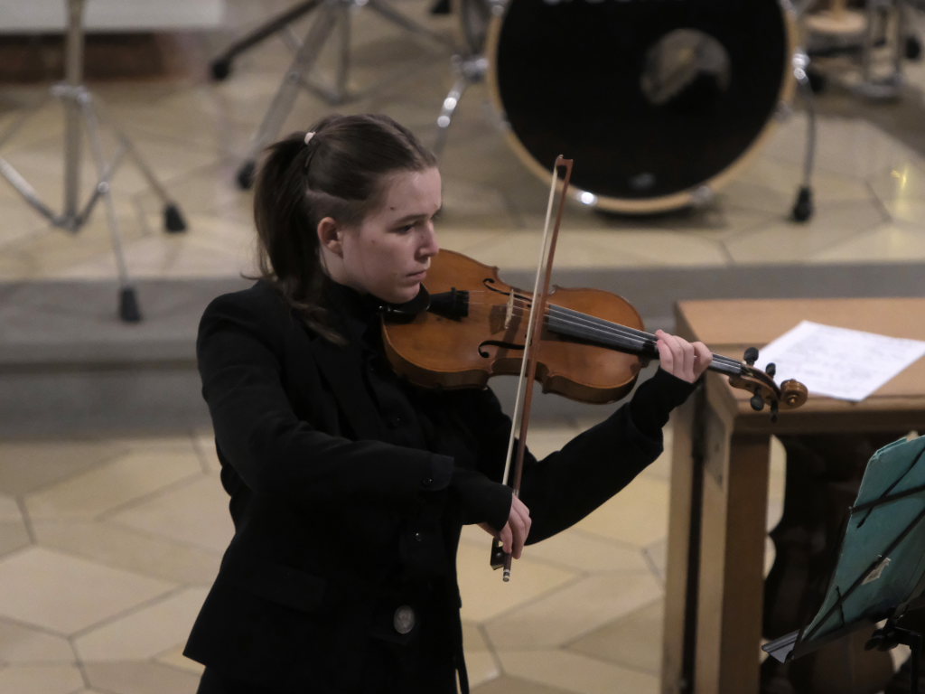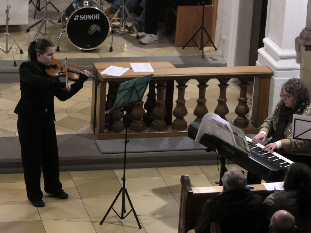 Bei „Haniel“ einem auf Klezmer-Musik basierenden Stück des zeitgenössischen deutschen Komponisten Peter Przystaniak konnte sich Elise Kazmaier mit ihrer Violine, neben Christine Braig am Piano, der musikalischen Gesamtleiterin dieses Konzertes, auszeichnen.