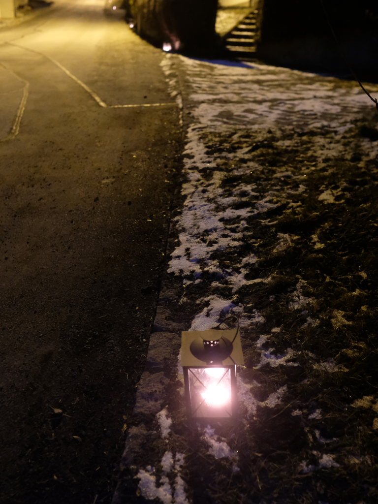 Ab dem Einbruch der Nacht um etwa 17.00 Uhr wurden die Laternenlichter am Straßenrand entzündet, die exakt ausgemessen zuvor von fleißigen Helfern alle zehn Meter am Straßenrand platziert worden waren und den Wanderern den Weg wiesen.