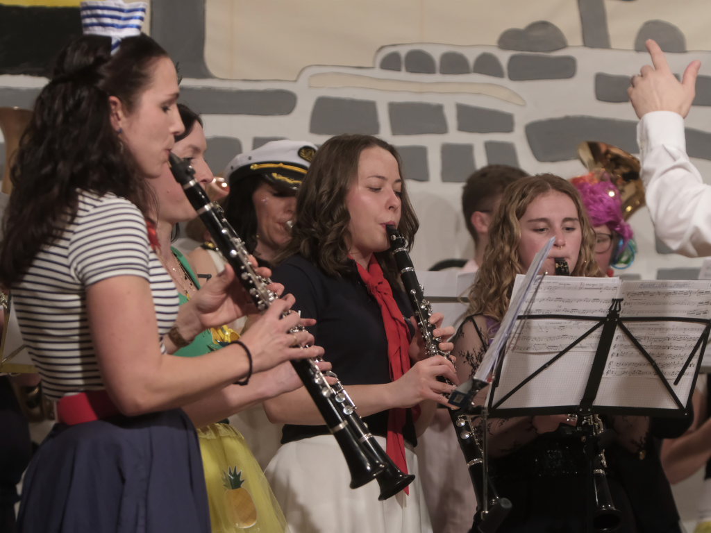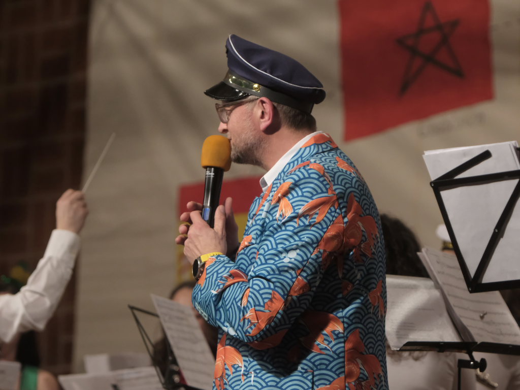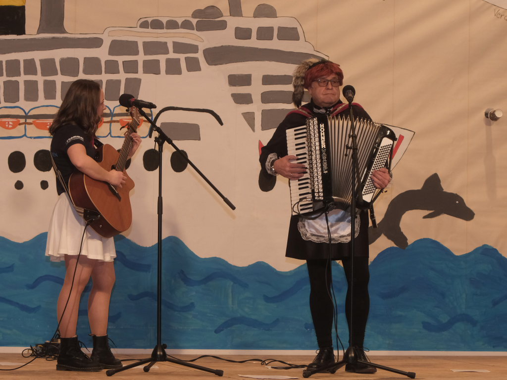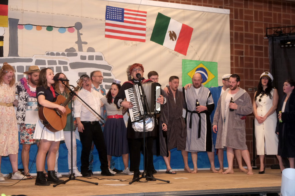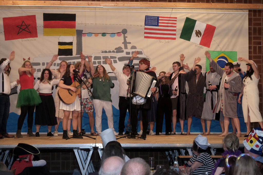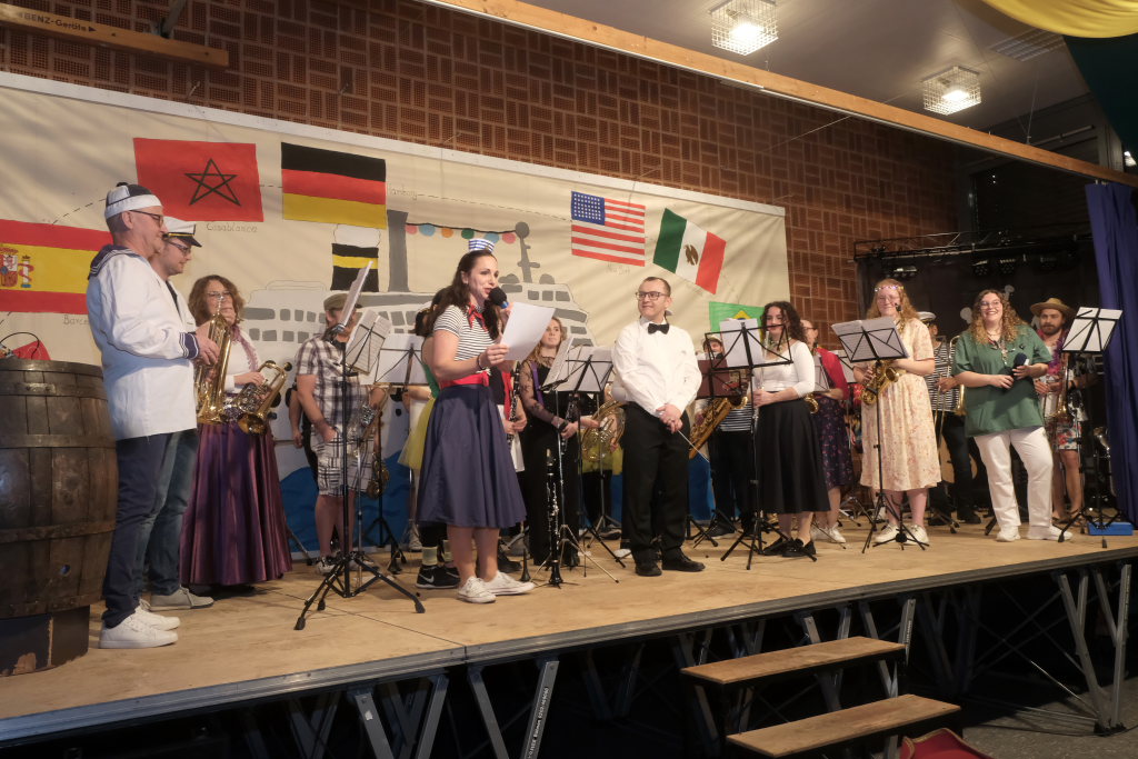 Im Foyer der Festhalle hieß Ines Haag als Chefin de Mission die „Passagiere“ der MS Eintürnen willkommen und lud sie an die Tiki-Tuba-Bar zu einem Gläschen Sekt ein, ehe sie ihre Kabinen, sprich ihre Tische, in der Halle aufsuchen durften. Dort nahm sie dann Schiffs- und Flugkapitän Heinrich Goldfisch alias Heinz Schele unter seine Fittiche, während Sophia Schneider allerlei Gesundheitstipps zum jeweiligen Landgang auf der musikalischen Weltreise parat hatte. Unter der Leitung von Dirigent Alexander Dreher wurde Musik aus Italien, aber auch nach einem Abstecher mit Flugkapitän Heinz Schele aus Mexico, Brasilien und den USA und – zurück auf dem Schiff – auch aus Afrika dargeboten.
