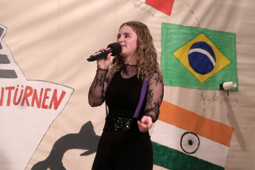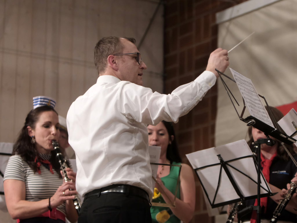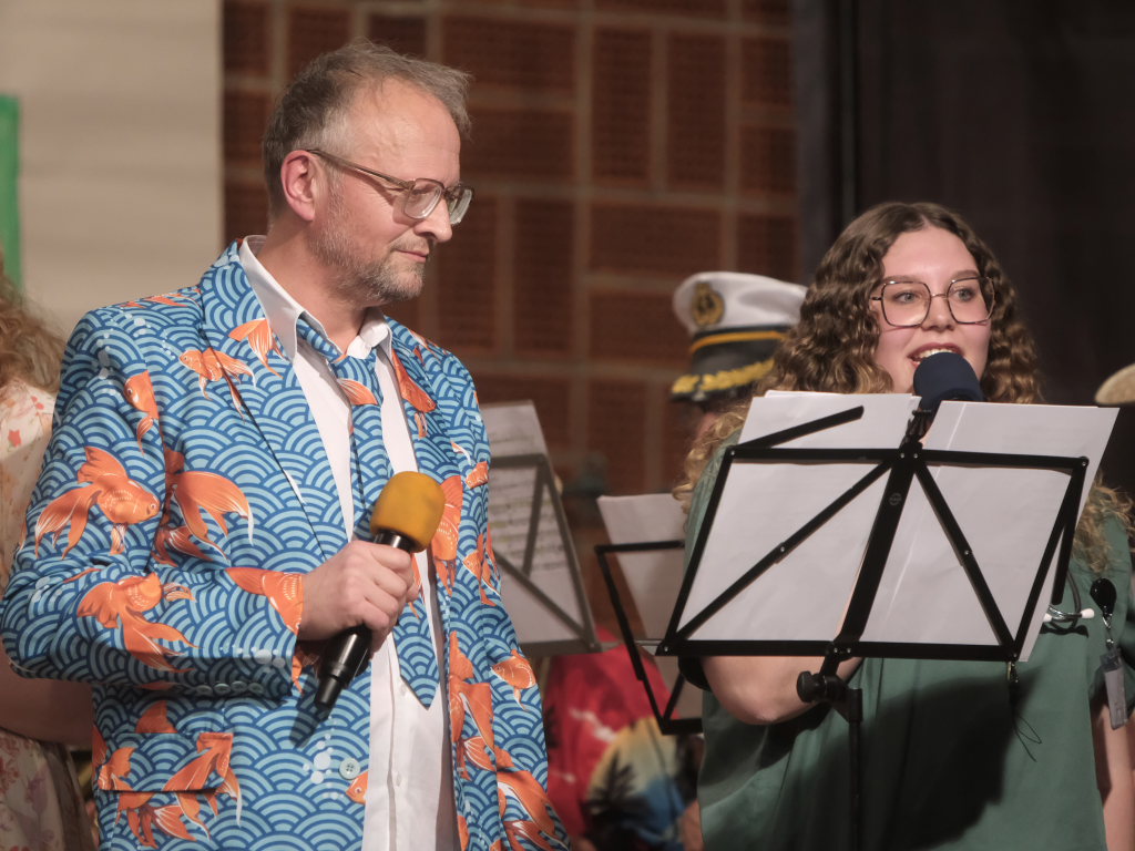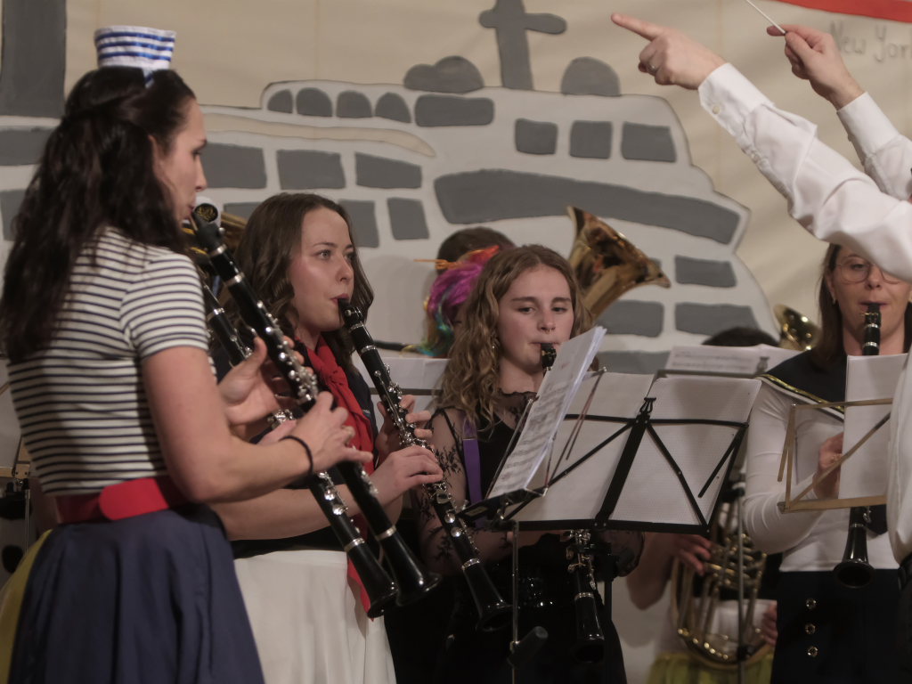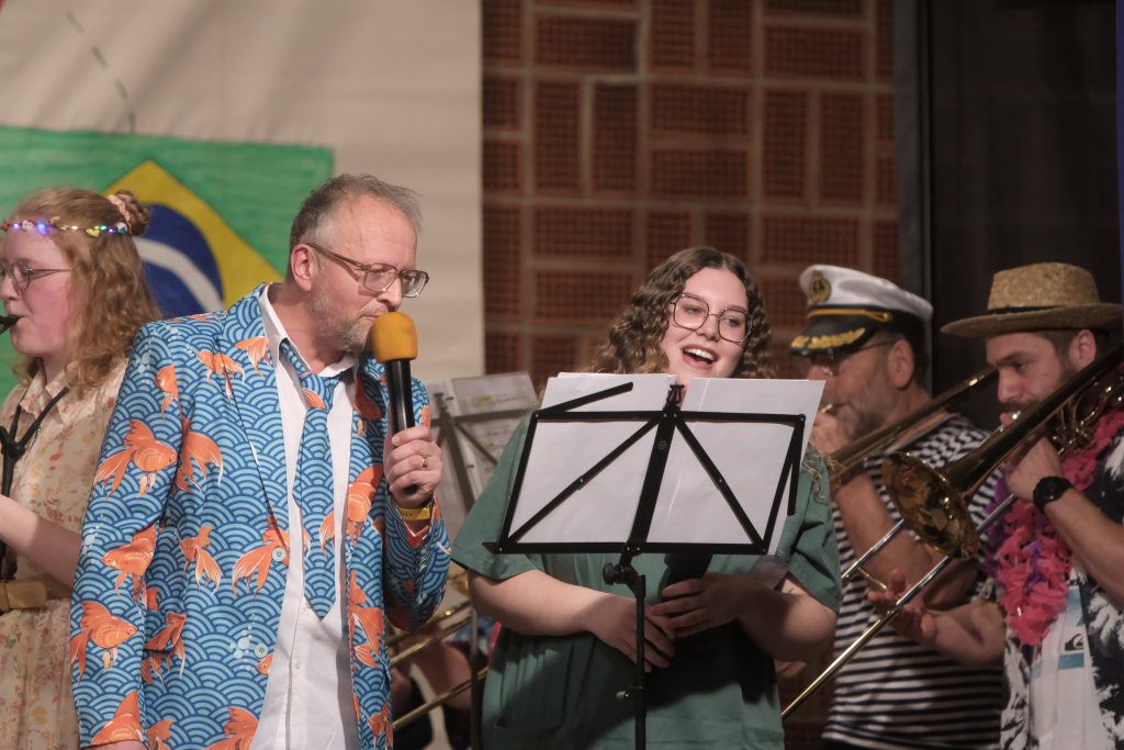 Im Foyer der Festhalle hieß Ines Haag als Chefin de Mission die „Passagiere“ der MS Eintürnen willkommen und lud sie an die Tiki-Tuba-Bar zu einem Gläschen Sekt ein, ehe sie ihre Kabinen, sprich ihre Tische, in der Halle aufsuchen durften. Dort nahm sie dann Schiffs- und Flugkapitän Heinrich Goldfisch alias Heinz Schele unter seine Fittiche, während Sophia Schneider allerlei Gesundheitstipps zum jeweiligen Landgang auf der musikalischen Weltreise parat hatte. Unter der Leitung von Dirigent Alexander Dreher wurde Musik aus Italien, aber auch nach einem Abstecher mit Flugkapitän Heinz Schele aus Mexico, Brasilien und den USA und – zurück auf dem Schiff – auch aus Afrika dargeboten.