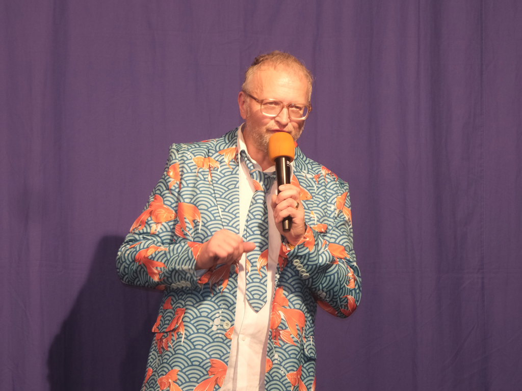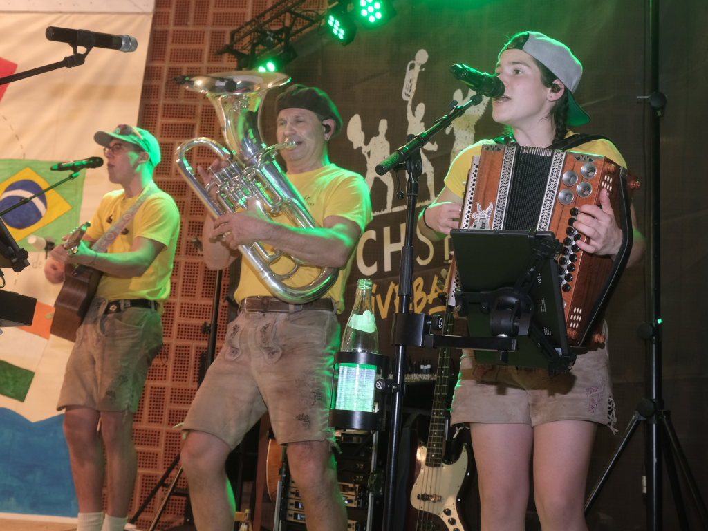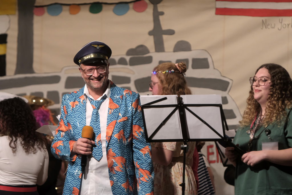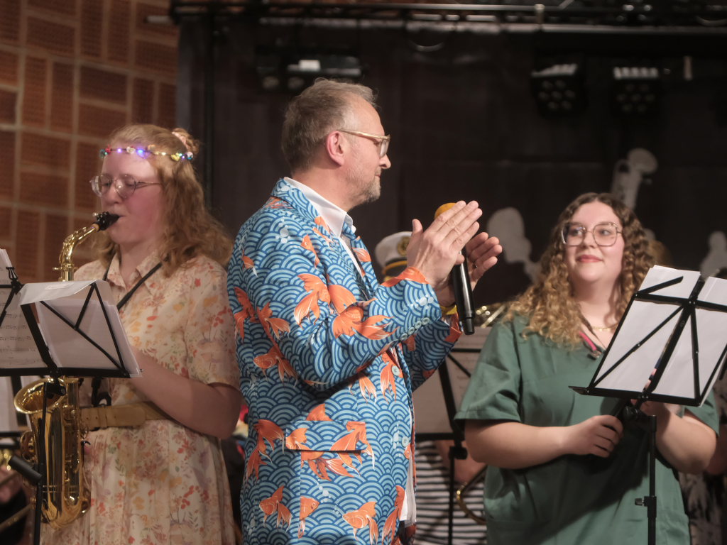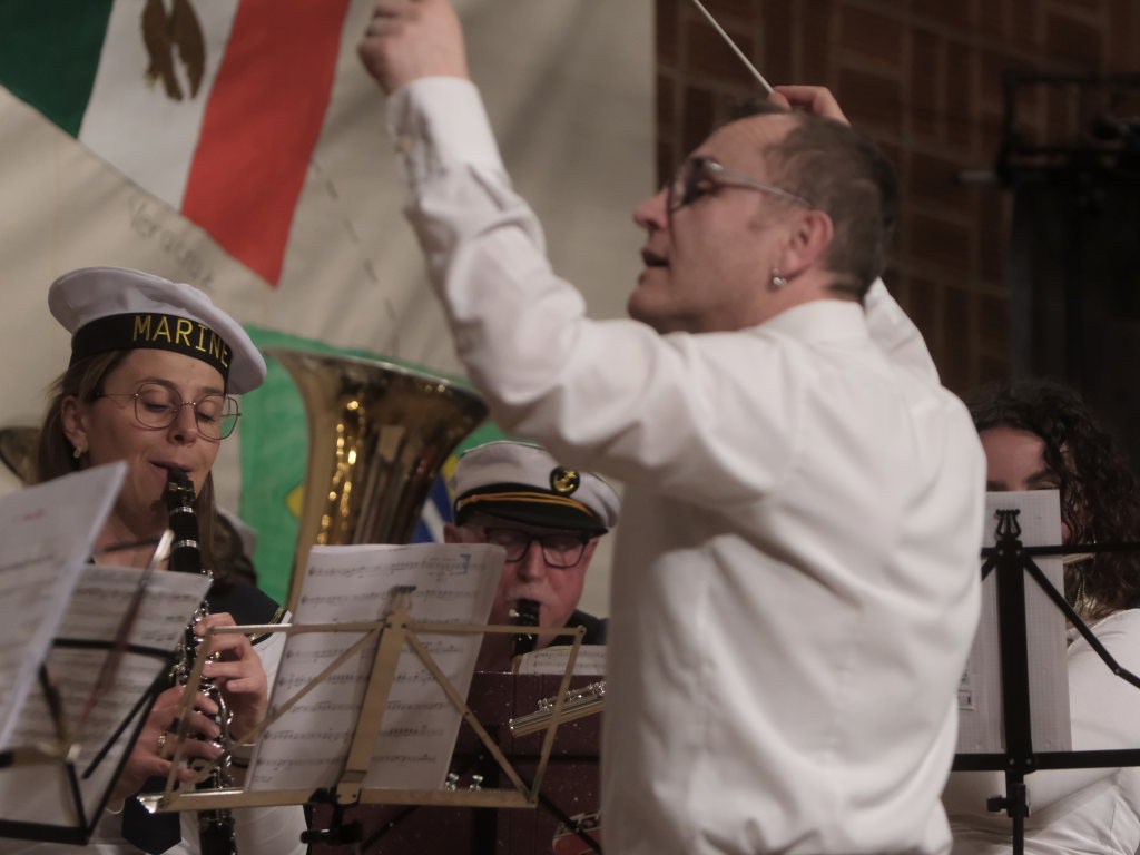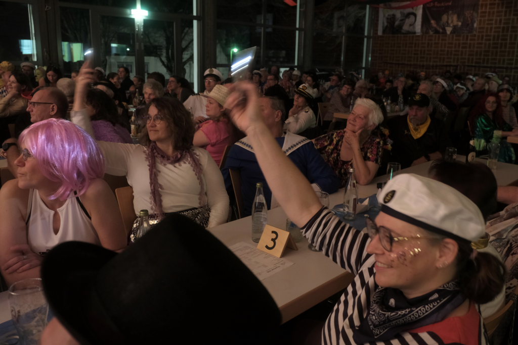 Im Foyer der Festhalle hieß Ines Haag als Chefin de Mission die „Passagiere“ der MS Eintürnen willkommen und lud sie an die Tiki-Tuba-Bar zu einem Gläschen Sekt ein, ehe sie ihre Kabinen, sprich ihre Tische, in der Halle aufsuchen durften. Dort nahm sie dann Schiffs- und Flugkapitän Heinrich Goldfisch alias Heinz Schele unter seine Fittiche, während Sophia Schneider allerlei Gesundheitstipps zum jeweiligen Landgang auf der musikalischen Weltreise parat hatte. Unter der Leitung von Dirigent Alexander Dreher wurde Musik aus Italien, aber auch nach einem Abstecher mit Flugkapitän Heinz Schele aus Mexico, Brasilien und den USA und – zurück auf dem Schiff – auch aus Afrika dargeboten.