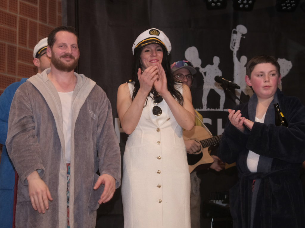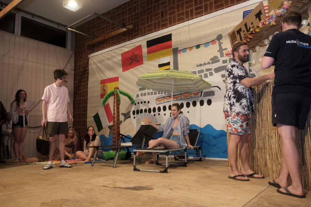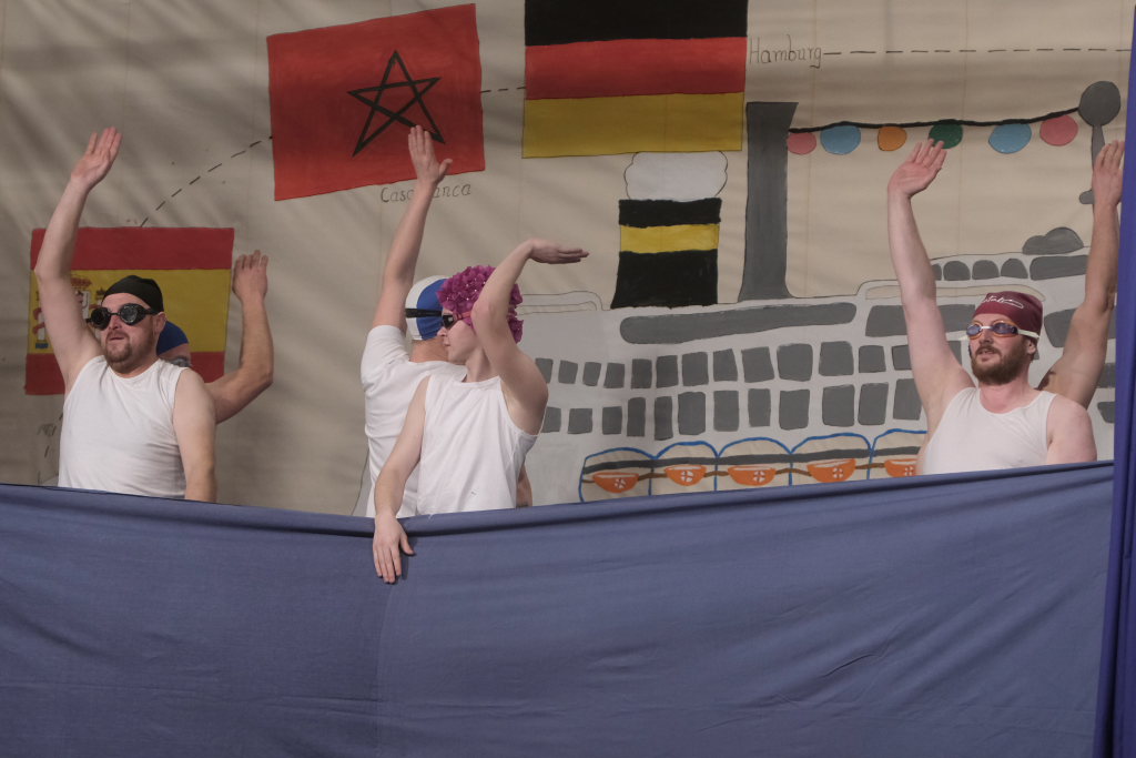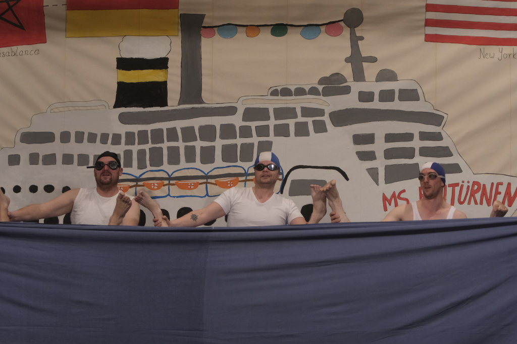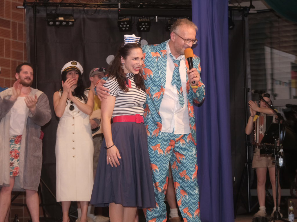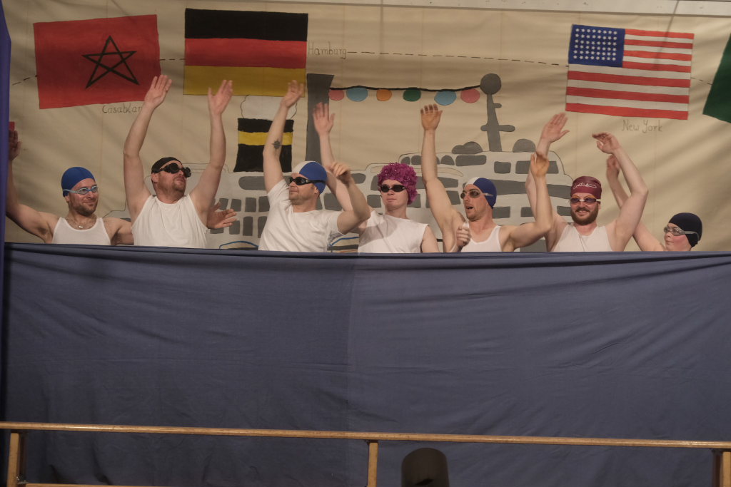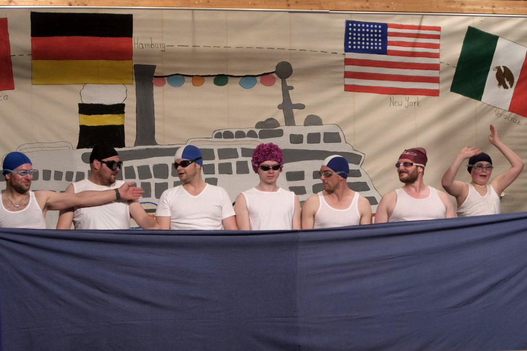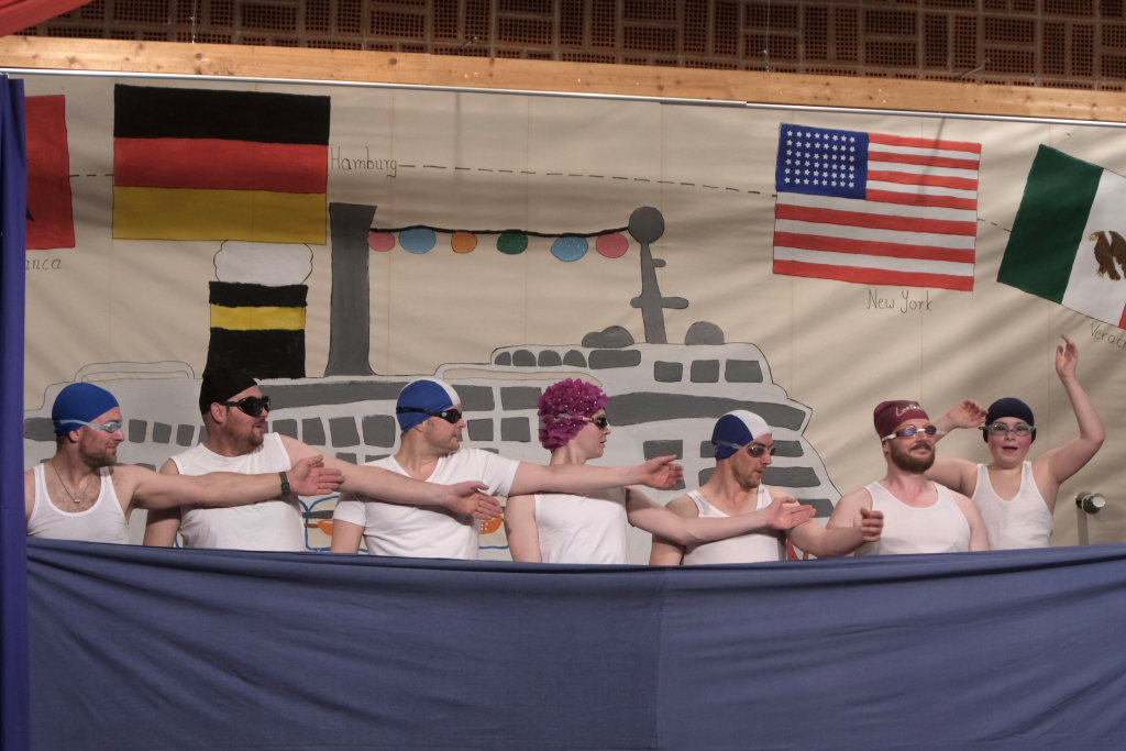 Tabea Stephan und Florian Weber begeisterten als altes Ehepaar, das sich in einem eigentlich sich harmlos anhörenden Lied nach vielen, vielen Ehejahren so richtig die Meinung geigte. Die Zugabe war danach natürlich ein Muss. Danach machten die Männer der Musikkapelle den Board-Pool des Kreuzfahrtschiffes zu ihrer Spielwiese bzw. ihrem Spielelement. Synchronschwimmen war angesagt, wobei das jüngste Teammitglied die ihm geltende Aufmerksamkeit besonders genoss, so dass er von seinen „Mitschwimmern“ auf den Boden der Realität (bzw. des Pooles) zurückgeholt wurde.
