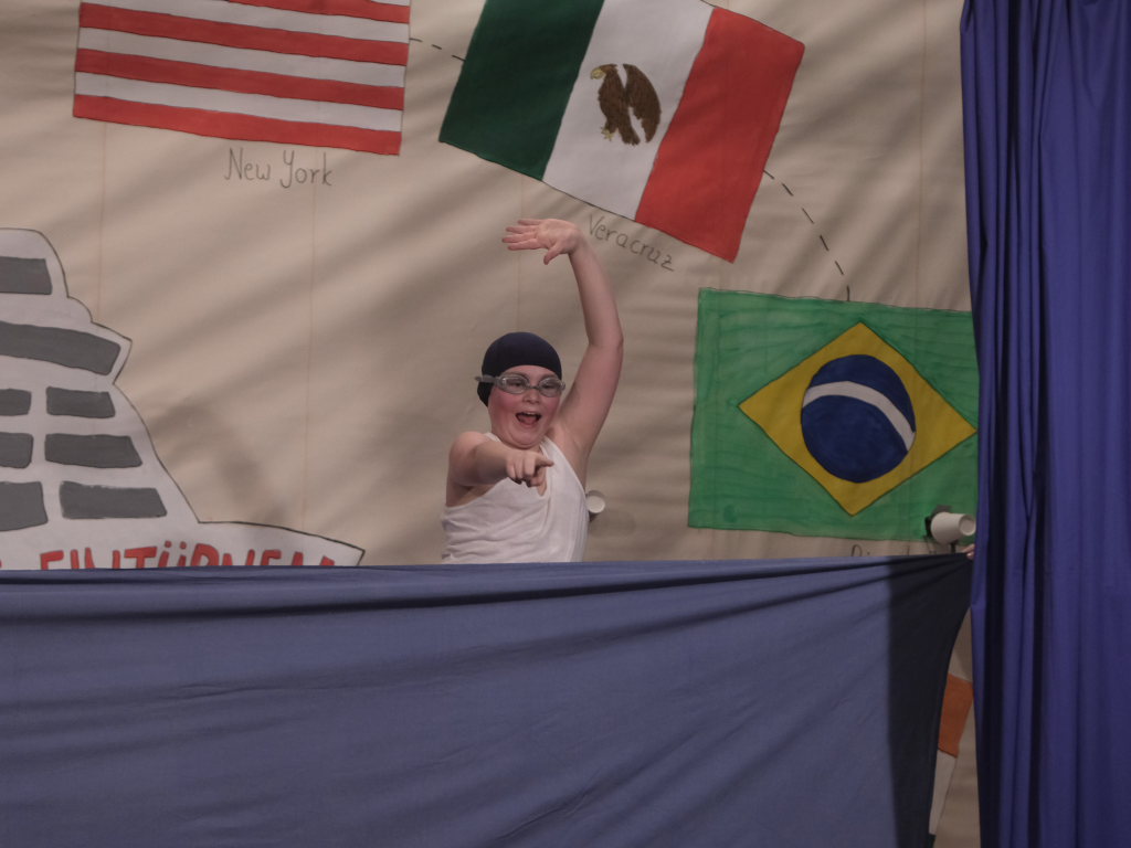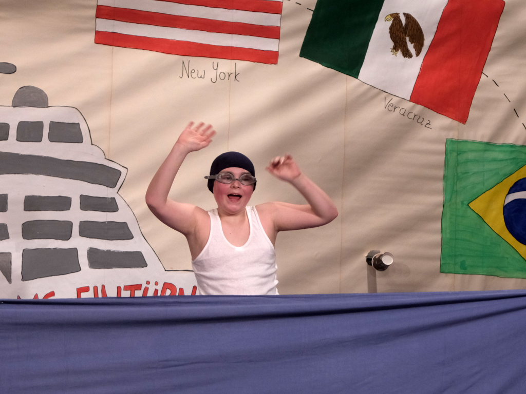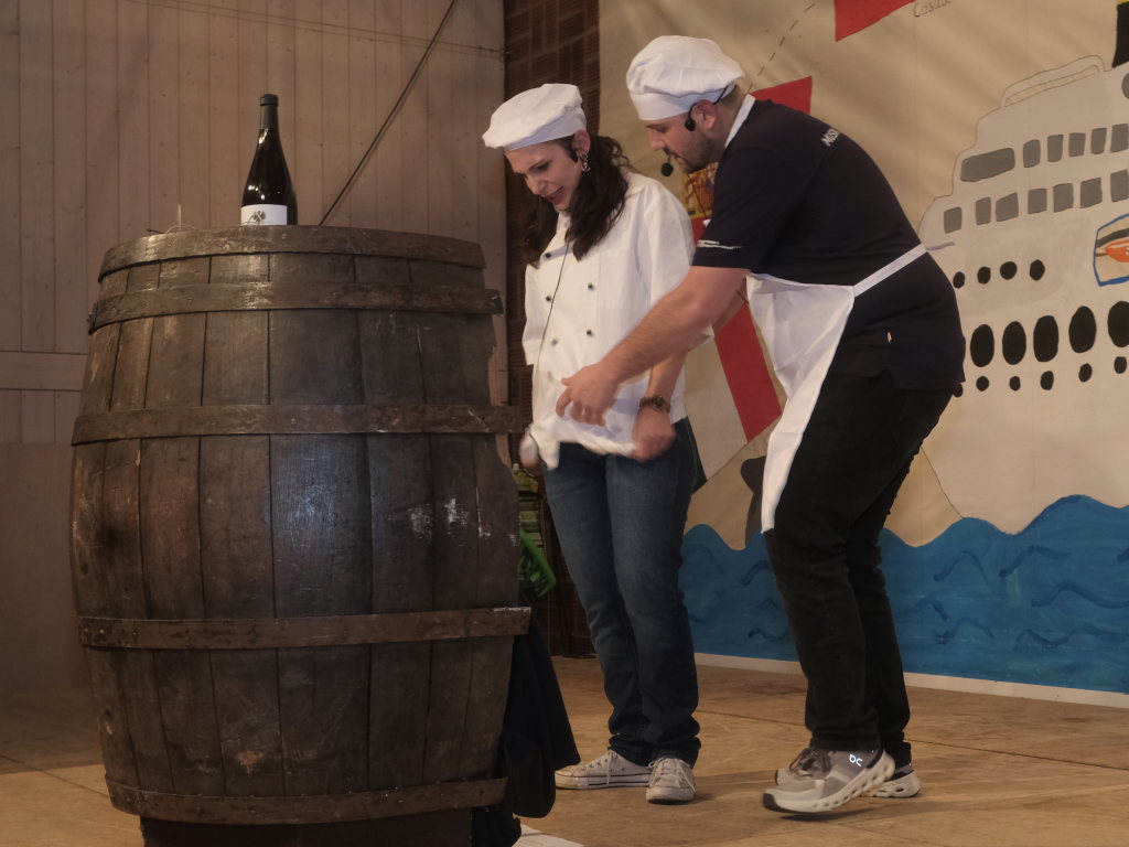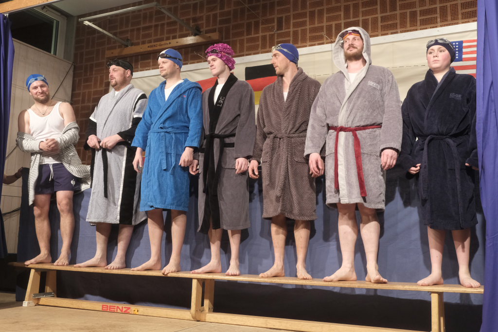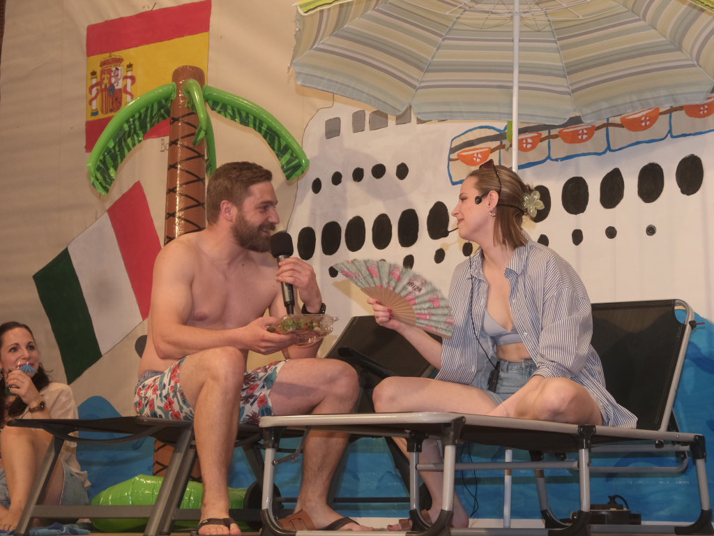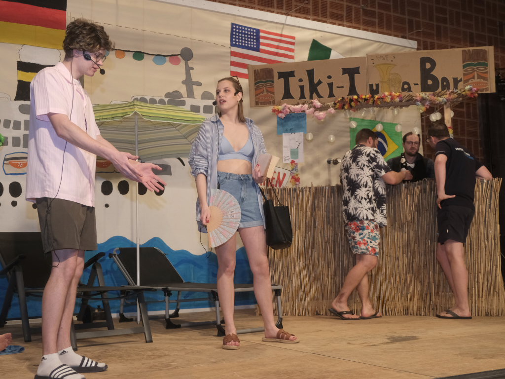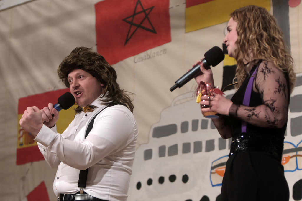 Tabea Stephan und Florian Weber begeisterten als altes Ehepaar, das sich in einem eigentlich sich harmlos anhörenden Lied nach vielen, vielen Ehejahren so richtig die Meinung geigte. Die Zugabe war danach natürlich ein Muss. Danach machten die Männer der Musikkapelle den Board-Pool des Kreuzfahrtschiffes zu ihrer Spielwiese bzw. ihrem Spielelement. Synchronschwimmen war angesagt, wobei das jüngste Teammitglied die ihm geltende Aufmerksamkeit besonders genoss, so dass er von seinen „Mitschwimmern“ auf den Boden der Realität (bzw. des Pooles) zurückgeholt wurde.