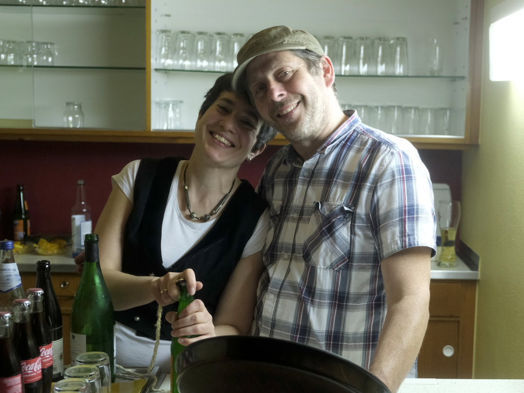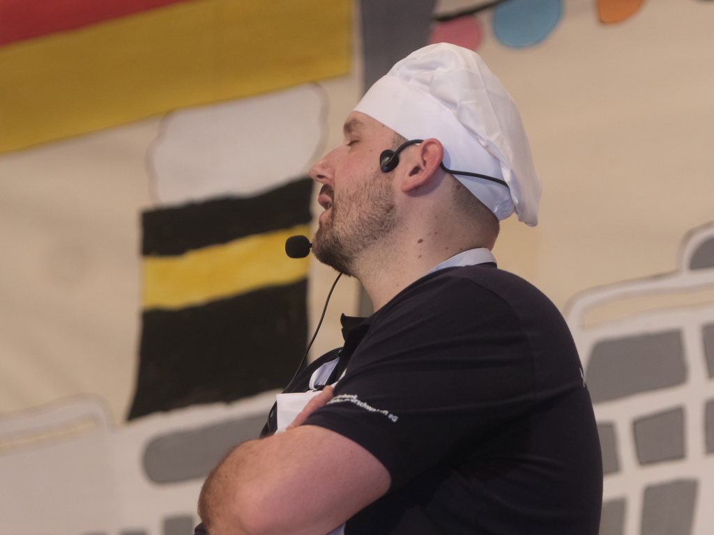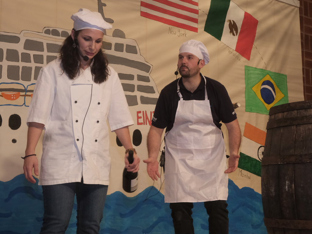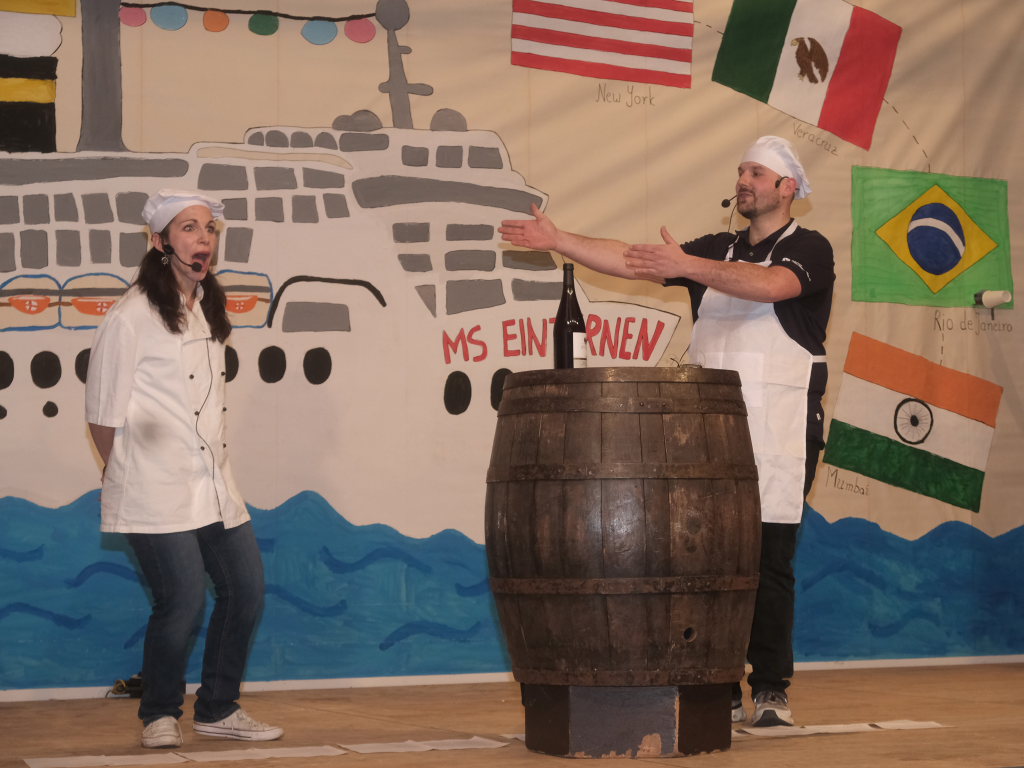 Anschließend hoben die Mannen von Tongebräu mit Berthold Leupolz, Heinz Schele und Günter Stephan unter der Taktgebung von Alexander Dreher das Bordorchester, das einst bei der Titanic bis zum bitteren Ende gespielt hatte, wieder aus den Tiefen des Mare Eintürniensis, unter anderem mit den Gschupften Nudla der Königlich privilegierten Waschhausvereinigung begleiteten sie das Geschehen auf der Bühne. Etwa das, was Ines Haag gemeinsam mit Roland Schmid in der Bordküche als begriffsstutziger Lehrling und pedantischer Chefkoch anrührten.