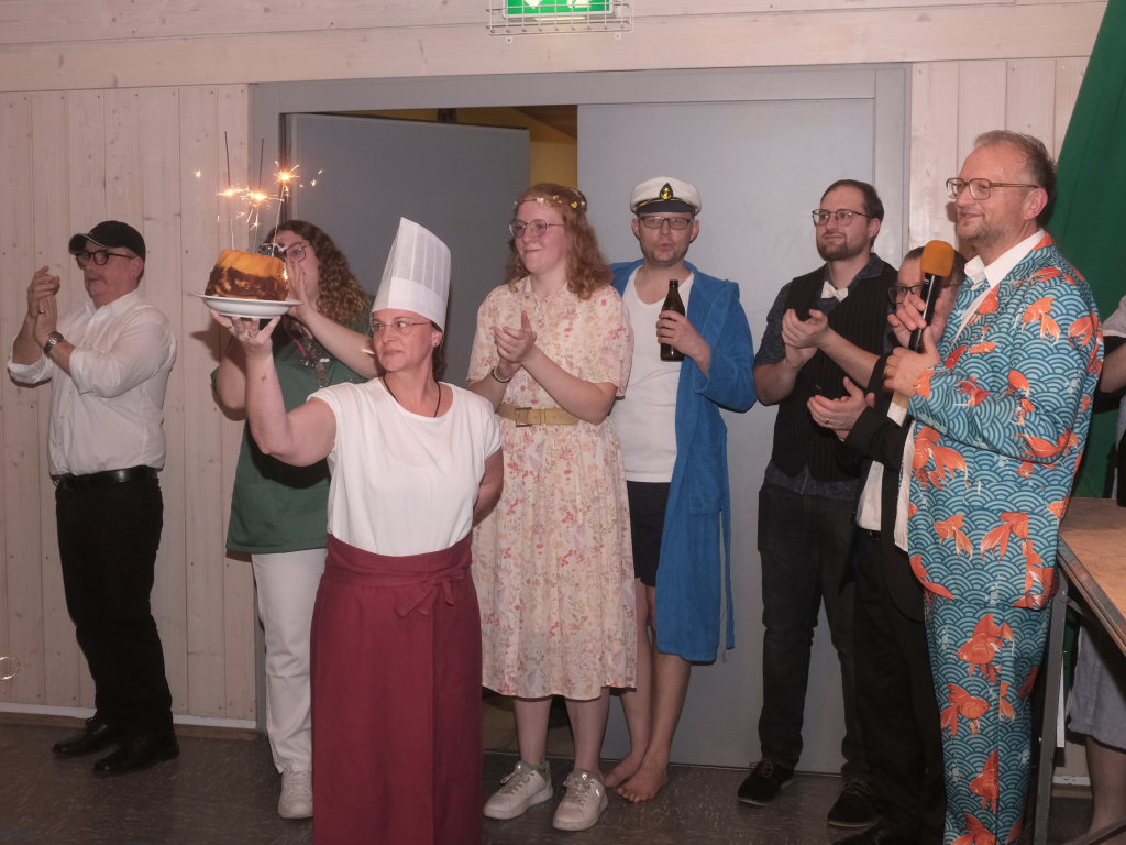 Aber damit war noch nicht Schluss. Heinz Schele fragte nämlich nach, was denn die Krönung einer jeden Kreuzfahrt bzw. einer jeden Traumschiff Episode ist: Natürlich das Kapitäns-Dinner mit den sprühenden Wunderkerzen. Und genau ein Solches Finale servierte die Küchencrew den Gästen auf der MS Eintürnen, die danach – nach dem Abbau der Bühne – zu den internationalen Melodien der „Falschspieler“ das Tanzbein Schwingen konnten.