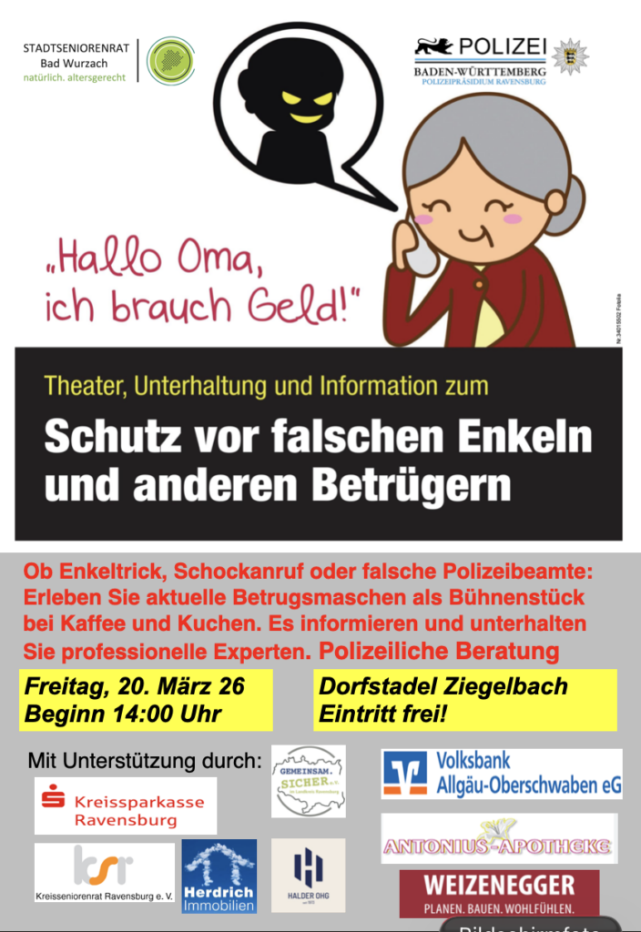 Bad Wurzach – Mit einem Theaterstück zur Prävention gegen Betrugsversuche wie „Enkeltrick“, Schockanrufe, „Falsche Polizeibeamte“ und „Lukrative Vermögensanlagen“ will der Stadtseniorenrat gemeinsam mit der Polizei Aufklärungsarbeit leisten. Das Theaterstück „Hallo Oma, ich brauch Geld“, aufgeführt von professionellen Schauspielern, wird am 20. März um 14.00 Uhr im Dorfstadel in Ziegelbach gezeigt; der Saal hat Platz für etwa 300 Personen.