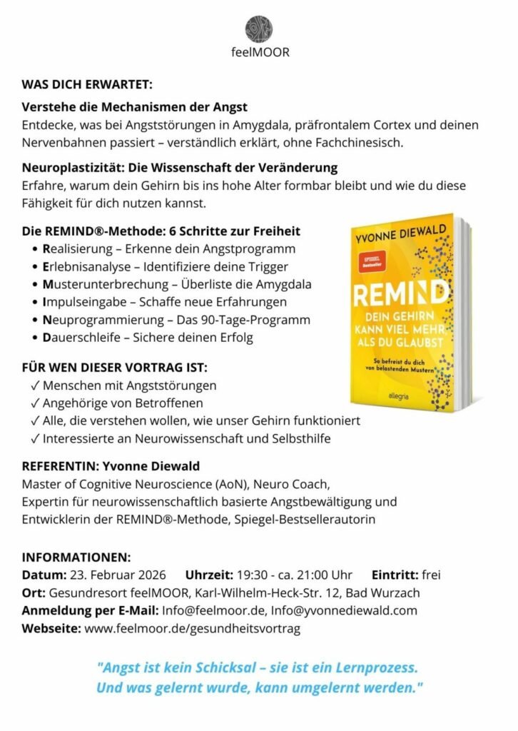 Bad Wurzach – Im Gesundresort feelMOOR in Bad Wurzach (Karl-Wilhelm-Heck-Str. 12) wird am Montag, 23. Februar, der Vortrag „Mechanismen der Angst“ der Angst angeboten (19.30 Uhr). „Angst ist die Reaktion des Körpers auf einen ganz bestimmten Auslöser – doch manchmal bleibt die Angst zu lange aktiv. Dann wird aus einem natürlichen Mechanismus eine unsichtbare Fessel , die das Denken, Fühlen und Handeln einschränkt“, heißt es in der Einladung. In ihrem Impuls-Vortrag „Wenn Angst zur Fessel wird – Wie Dein Gehirn lernt, sich zu befreien“ zeigt die Spiegel-Bestsellerautorin und Neuro-Coach Yvonne Diewald, wie Angst im Gehirn entsteht, und vor allem, wie sie sich nachhaltig auflösen lässt. Wissenschaftlich fundiert, alltagsnah erklärt und mit vielen Aha-Momenten, die sofort wirksam werden können. Sie erfahren, warum sich Angst so hartnäckig hält, weshalb „positives Denken“ nicht funktioniert und wie Neuroplastizität echte innere Freiheit möglich macht.“ Empfohlen ist der Vortrag von Dr. Ana Matt, Chefärztin des Medizinzentrums des feelMOOR-Gesundheitsresorts. Anmeldungen unter www.feelmoor.de. Nachstehend stellt Referentin Yvonne Diewald den Abend vor: