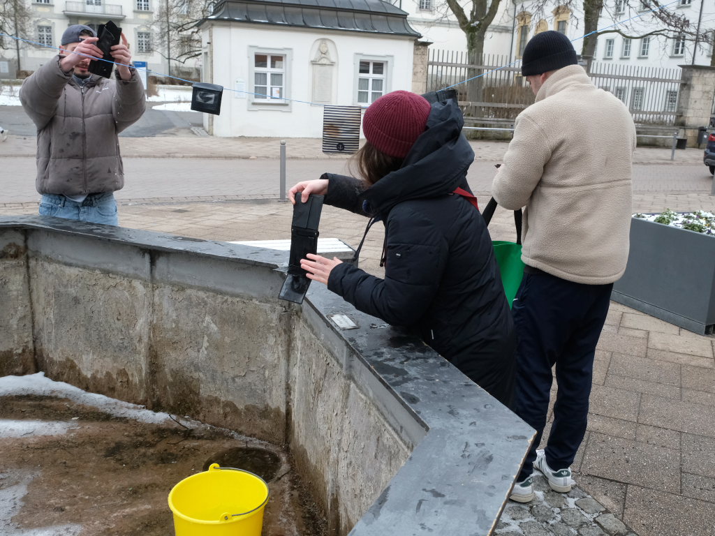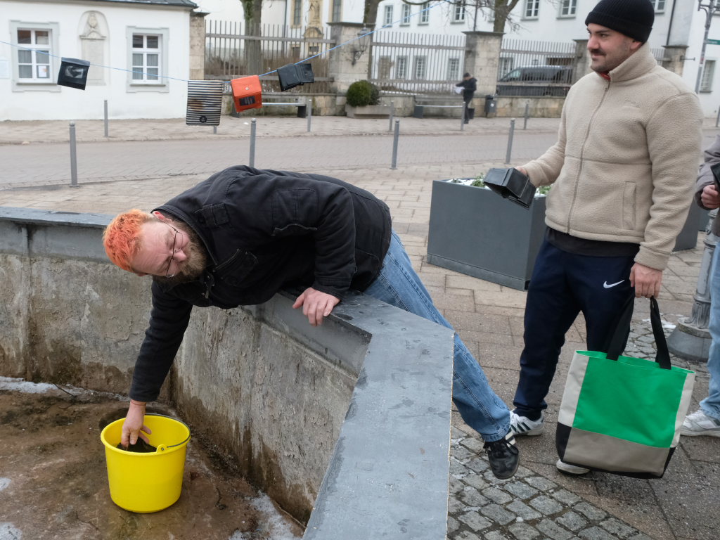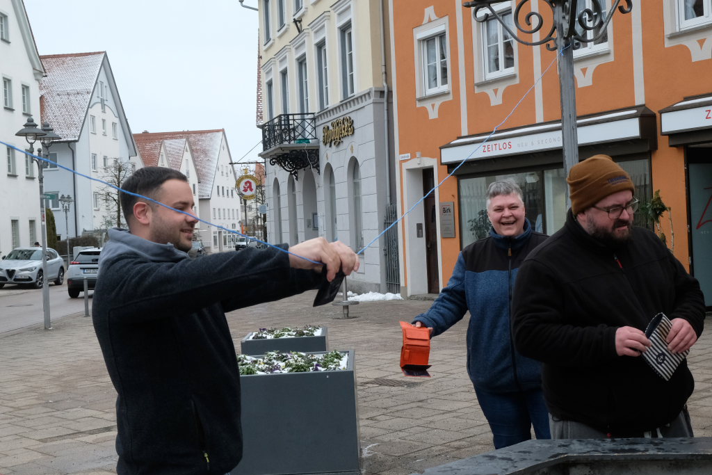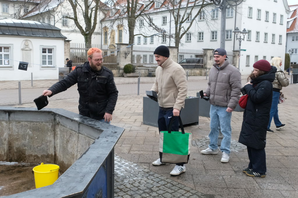 Nach der Geldbeutelwäsche folgt üblicherweise der letzte Arbeitseinsatz der diesjährigen Fasnetssaison. Die Geldbeutelwäsche ist nämlich nur die spaßmachende und motivierende Kür: Der Hauptgrund, warum man sich am Stadtbrunnen traf, waren die Einlagerungsarbeiten der Fasnetsutensilien. Wie im Vorjahr ging es auch in diesem Jahr wieder flott zur Sache: Weil nach dem Abbau des Disco-Zelts am gestrigen Dienstagvormittag ebenfalls noch Zeit und Personal-Kapazitäten vorhanden waren, wurden gleich auch die Fasnetsbändel vom Umzugsweg abgehängt, was früher erst nach der Geldbeutelwäsche erfolgte. Zunftmeister Dominic Neher freute sich, denn dank vieler neuer Mitglieder wurden die Arbeitseinsätze auf mehrere Schultern verlagert und damit konnten sie auch schneller erledigt werden.