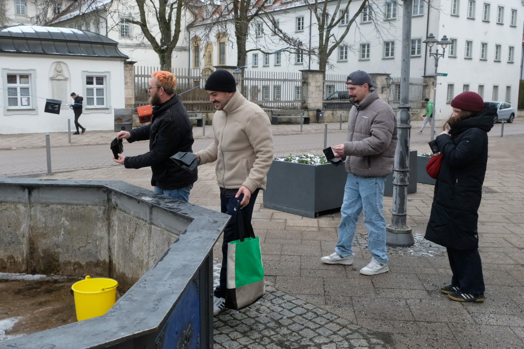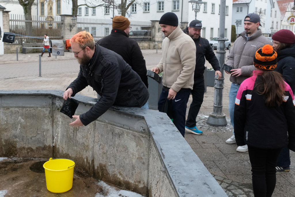 Wie immer am Aschermittwoch um 11.11 Uhr trafen sich auch dieses Jahr wieder die Mitglieder der Riedmeckelerzunft Bad Wurzach am Stadtbrunnen zur traditionellen „Geldbeutelwäsche“. Um dort mit warmen Wasser aus Plastikeimern – der Stadtbrunnen war noch trockengelegt – ihre vom vielen Feiern leeren Geldbeutel zu reinigen. Die Tradition der Geldbeutelwäsche ist in der alemannischen Fasnet im Schwarzwald schon sehr lange weit verbreitet‚ aber auch im bayerischen Fasching ist sie ein wichtiges Ritual geworden.