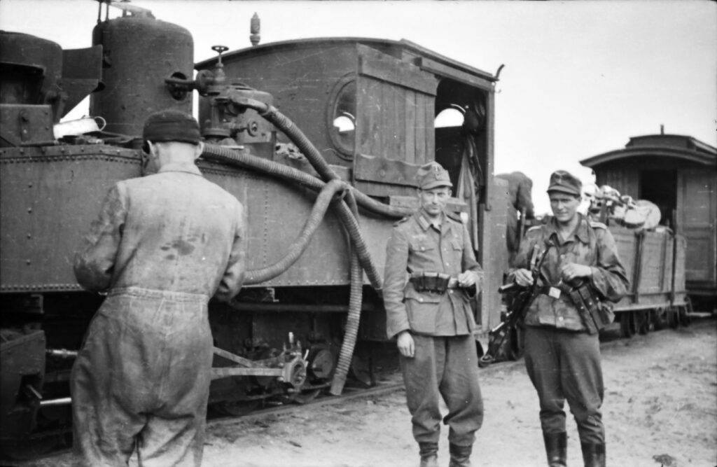 Die Gebrüder Widmann vor der Kleinbahn, mit der Albert unterwegs war. Bei der Lok handelt es sich um eine deutsche Brigadelokomotive.