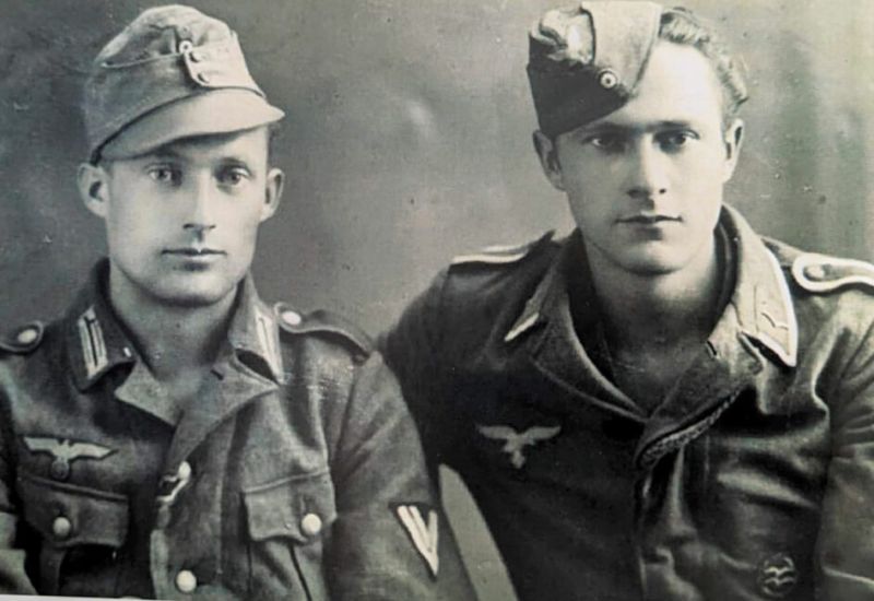 Die Brüder Alois (links) und Albert Widmann (rechts) posieren zur Erinnerung. Aus einem der Briefe Alberts geht hervor, dass die Aufnahme zwischen 1943 und 1944 entstanden ist.