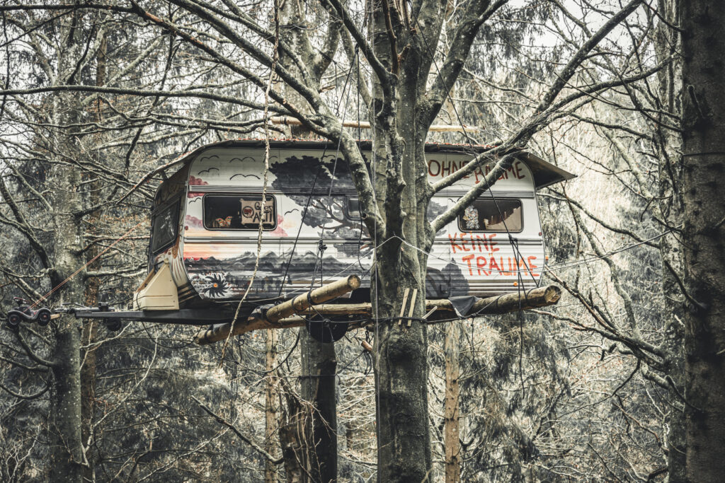 Ein alter Wohnwagen dient als regendichtes Baumhaus.