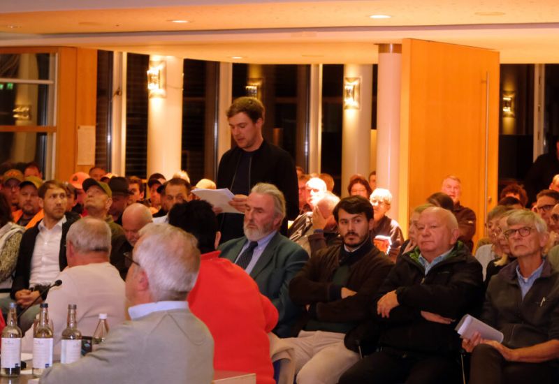 Zur Gemeinderatssitzung am 13. Oktober kamen rund 200 ZuhörerInnen in den Kursaal nach Bad Wurzach. Bei der Bürger-Fragerunde sprach sich Landwirt Nicolas Sauter aus Ziegelbach (stehend) gegen das Biosphärengebiet aus – vermutlich zum Gefallen der Schlossherren von Zeil und Wolfegg (rechts neben Sauter sitzend). Foto: Uli Gresser