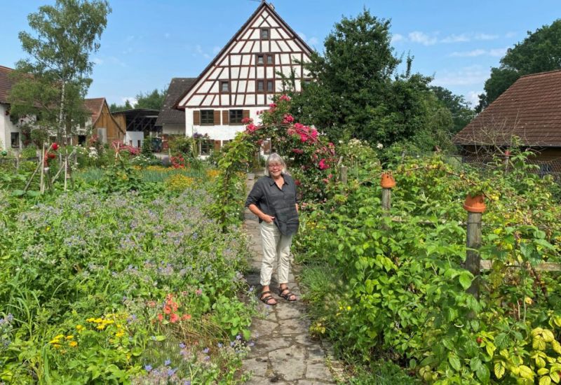 Himbeeren und schwarze Johannisbeeren (diese Vitamin-C-Bomben mögen ihre fünf Enkel besonders gerne) werden zu Marmelade verarbeitet, Holundersaft mit dem Apfelsaft der hofeigenen Streuobstwiesen gemischt, Ringelblumenauszüge kommen in Salbe, Johanniskraut wird in Olivenöl angesetzt. Kräuter dienen wie früher als Apotheke Gottes, auch mit ihnen kennt sich die fröhliche Frau gut aus. Kürzlich konnte sie beim Tag der Offenen Gartentür rund 200 Interessierte durch ihr buntes Reich führen.