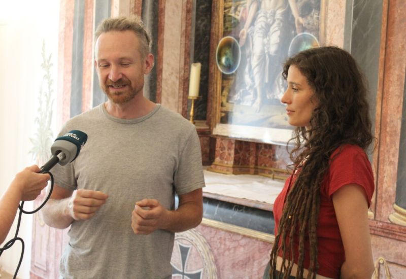 Die studierte Textildesignerin Ria Wank (*1988 Cottbus) und Wolfgang Ganter (*1978 Stuttgart) sind seit 2020 ein Paar, das zwischen Berlin und Brandenburg pendelt. Die einen sehr verliebten Eindruck hinterlassende Cottbuserin hat für Achberg eine neue Technik entwickelt, die fern von ihren fotografischen Arbeiten liegt. Sie wollte schon lange wieder zu ihren textilen Wurzeln zurück und weg von der Chemie, um ausschließlich mit organischen Naturmaterialien zu arbeiten. Sie findet es „einfach wunderbar“ zu erleben, wie die neuen Werke gedeihen und während ihrer Entstehung zum Leben erweckt werden.
