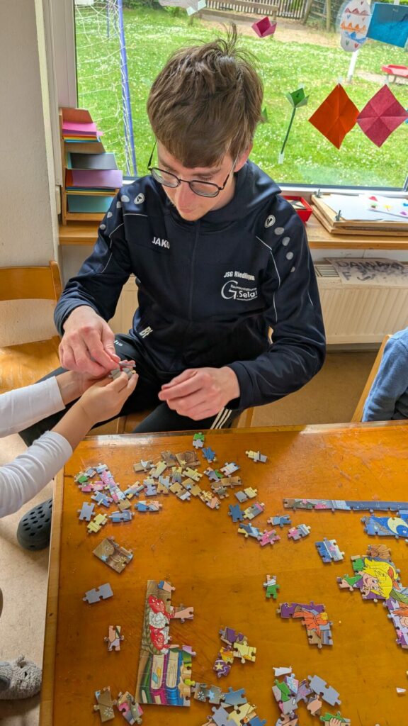Ich begann im September 2024 meinen Bundesfreiwilligendienst in der Katholischen Tagespflege in Riedlingen. Es handelt sich um eine teilstationäre Einrichtung, bei der die Tagesgäste morgens per Fahrdienst geholt und nachmittags wieder nach Hause gebracht werden. Die Aufgabenfelder der Bundesfreiwilligen waren ab Tag eins fordernd, aber vielseitig. Auf der einen Seite stehen hauswirtschaftliche Tätigkeiten wie Einkaufen, Essen austeilen, die Tische putzen und den Boden kehren. Die andere Hälfte bilden die pflegerischen Tätigkeiten „bei den Leuten“: sich mit den Senioren unterhalten, Brettspiele spielen, Aktivierungen, Vorträge und Spiele planen und vieles mehr.