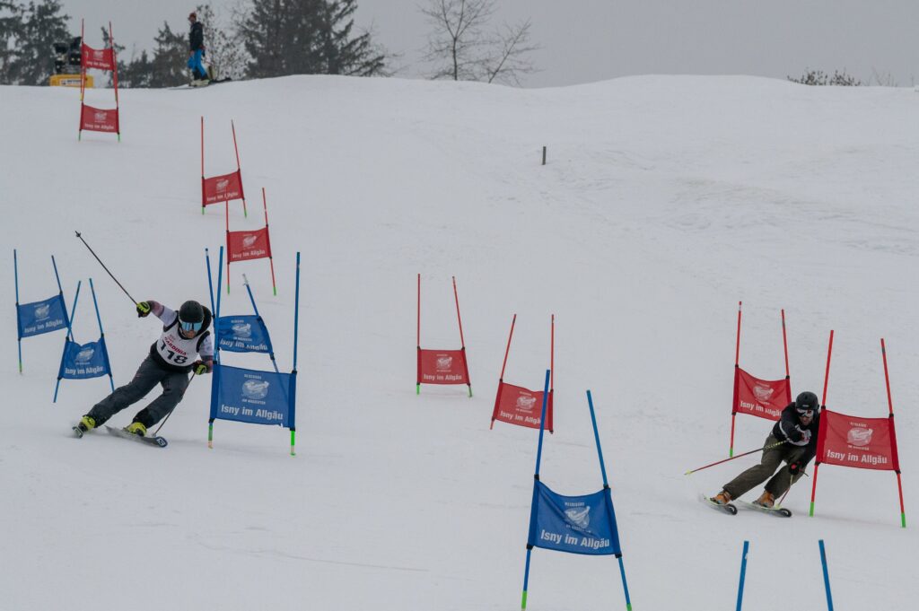 Ein Team des WSV Isny um die Organisatoren Steffen Zipperer und Susanne Holland hatte am Vorabend ein Startgate eingegraben, so dass die zwei gegeneinander fahrenden Starter gleichzeitig auf die zwei rhythmisch und synchron ausgesteckten Slalomläufe starten konnten. „Blue Course ready, red course ready“, dann ein Piepsen und die Startklappen gehen auf.