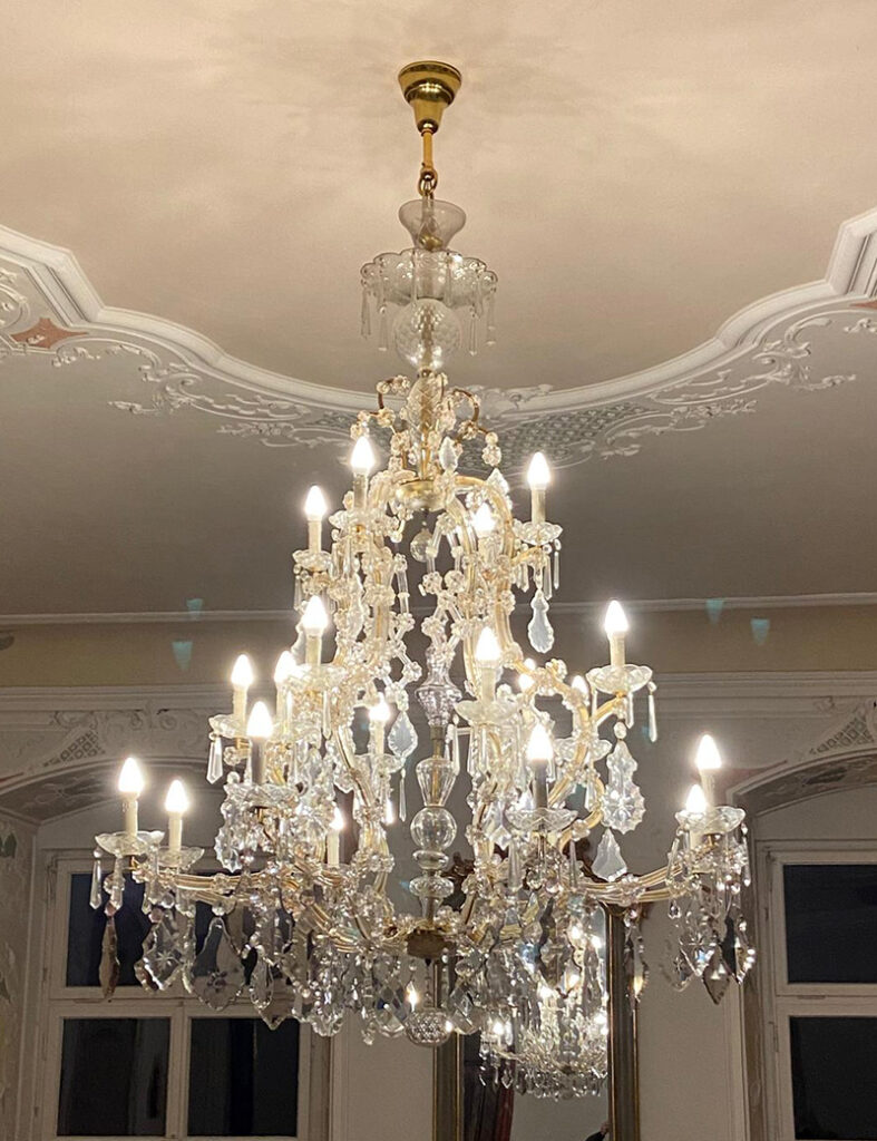 Der beeindruckende Kronleuchter im Trauzimmer, das einst der Kreißsaal zu Zeiten der Nutzung des Schlosses als Krankenhaus gewesen ist. Foto: Julian Aicher