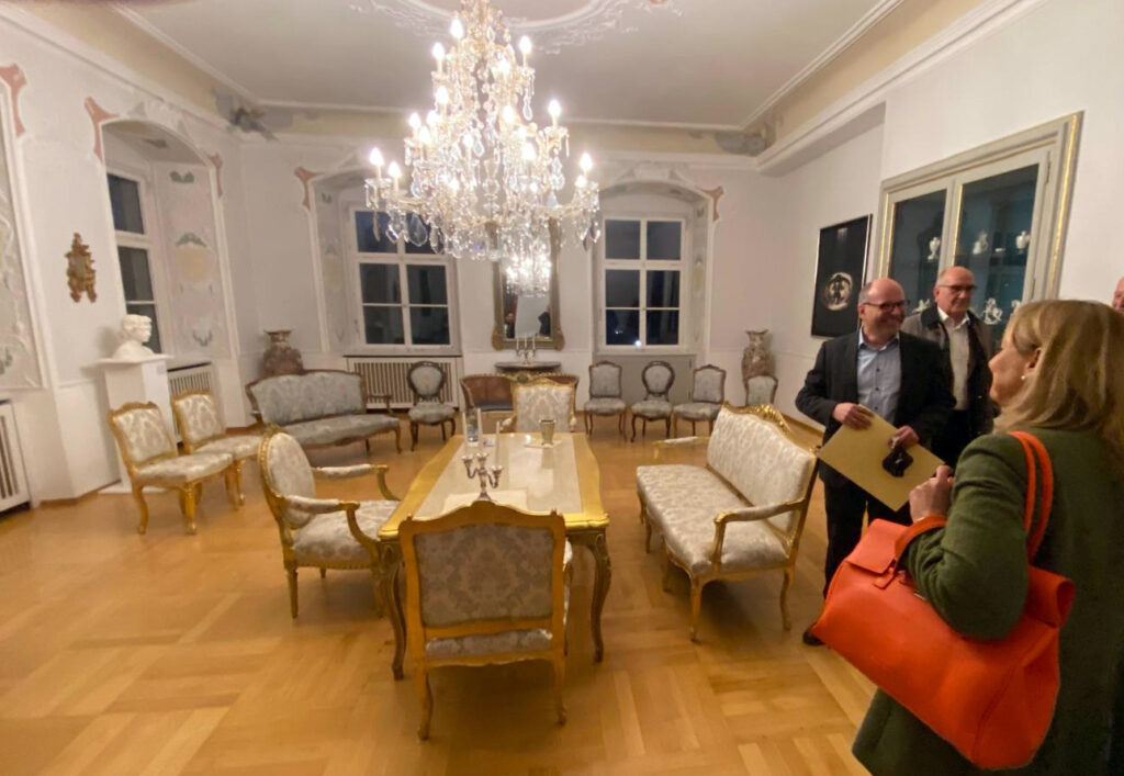Das Trauzimmer der Gemeinde Kißlegg im Neuen Schloss. Anlässlich des Besuches aus Stuttgart machte Bürgermeister Krattenmacher noch eine kleine Führung durch das Neue Schloss, einst eine Residenz der Herrschaft Waldburg-Wurzach, später auch als Krankenhaus genutzt und heutzutage eine Bürgerschloss mit vielerlei kommunalen und kulturellen Funktionen. Foto: Julian Aicher