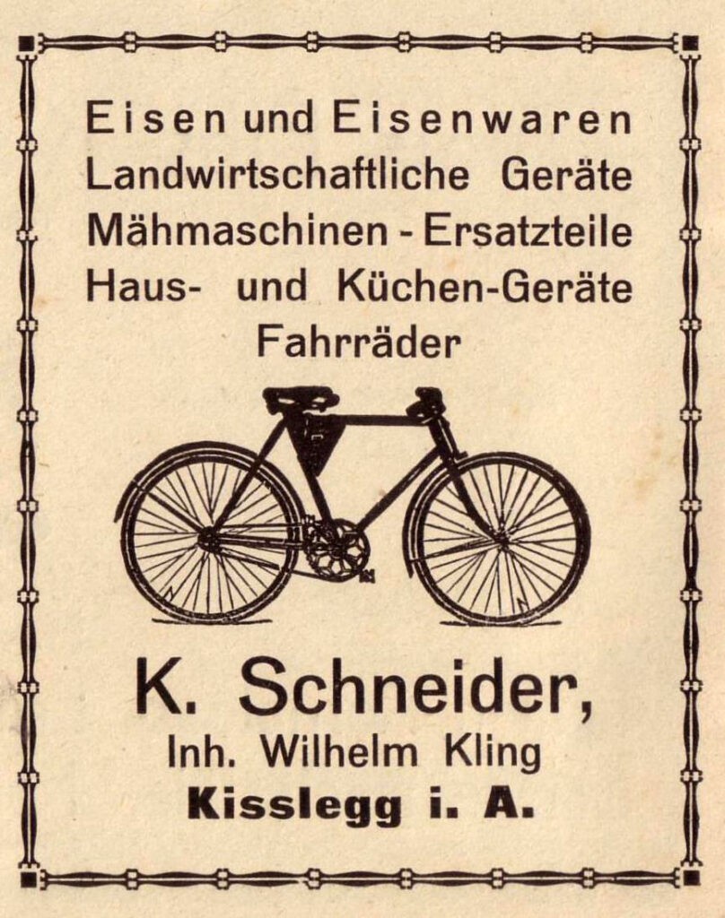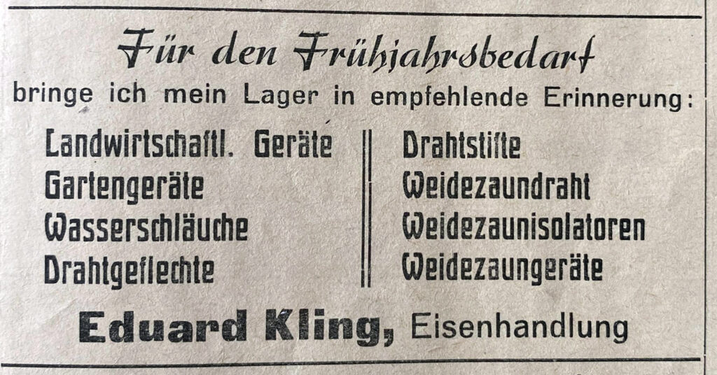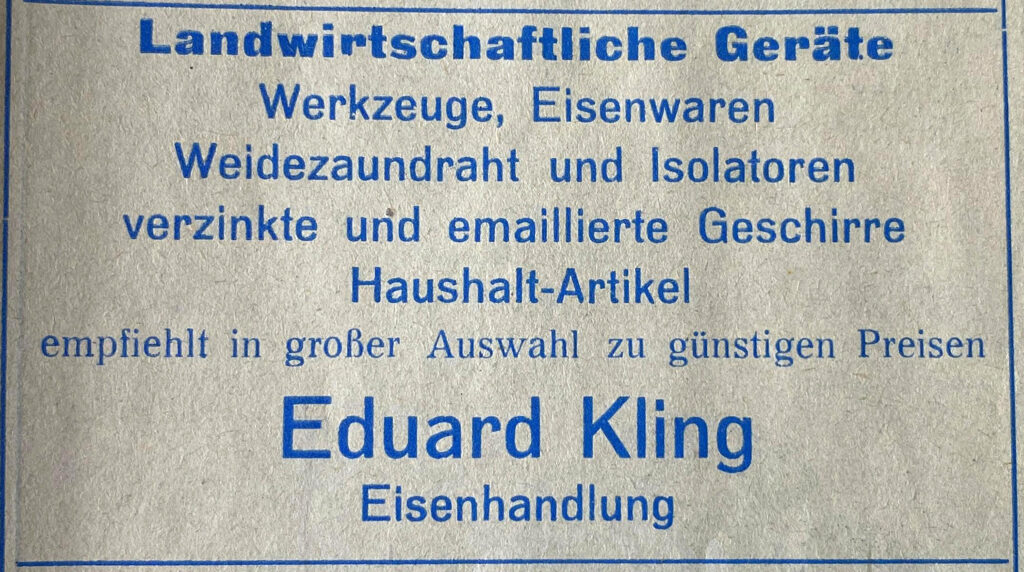 Als Ladengeschäft wurde es erstmals 1906 von Kreszentia Schneider, der Ehefrau des Schulmeisters Eduard Schneider, betrieben. Verkauft wurden dort Fahrräder, Mähmaschinen, landwirtschaftliche Geräte sowie Haus- und Küchengeräte. Später wurde der Laden von der Tochter Thekla und ihrem Ehemann Eduard Kling übernommen und das Sortiment wurde um viele Dinge des täglichen Bedarfs erweitert. Schwerpunkt lag auf den Eisenwaren; vom Stacheldraht über Werkzeug bis hin zur Mausefalle konnte dort alles erworben werden. Rodelschlitten, Kinderski und die passenden Skistöcke fand man hier genauso wie Luftgewehre und Messer. Viele Haushaltsartikel wie Töpfe und Pfannen waren in der Auslage, Nägel, Schrauben, Haken in den unzähligen kleinen Schubladen der Wandschränke und später, als die AKO in Kißlegg produzierte, konnte man beim Kling auch Weidezaundraht, Isolatoren und Weidezaungeräte kaufen. Waren, die im Laden keinen Platz fanden, wurden im 30 Meter entfernten Magazin untergebracht, wo bis heute noch der Hebekran an der Decke zu sehen ist.