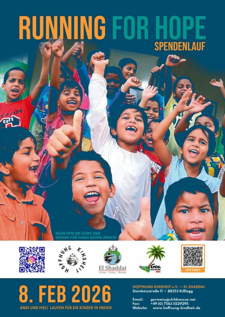 Kißlegg / Goa (Indien) – Es ist noch dunkel, wenn sie die Laufschuhe schnüren. Die Luft ist warm, schwer, fremd. Palmen wiegen sich im Wind, irgendwo erwacht eine Stadt. In wenigen Minuten werden Andreas Kolb und Hielian Wiedermann loslaufen – 21 Kilometer durch Goa, durch Hitze, Schweiß und Zweifel. Doch was sie antreibt, ist stärker als jede Erschöpfung: die Hoffnung auf ein besseres Leben für Kinder, die kaum Chancen haben. Am 8. Februar 2026 nehmen die beiden Allgäuer am Goa-Halbmarathon in Panjim, Indien, teil.