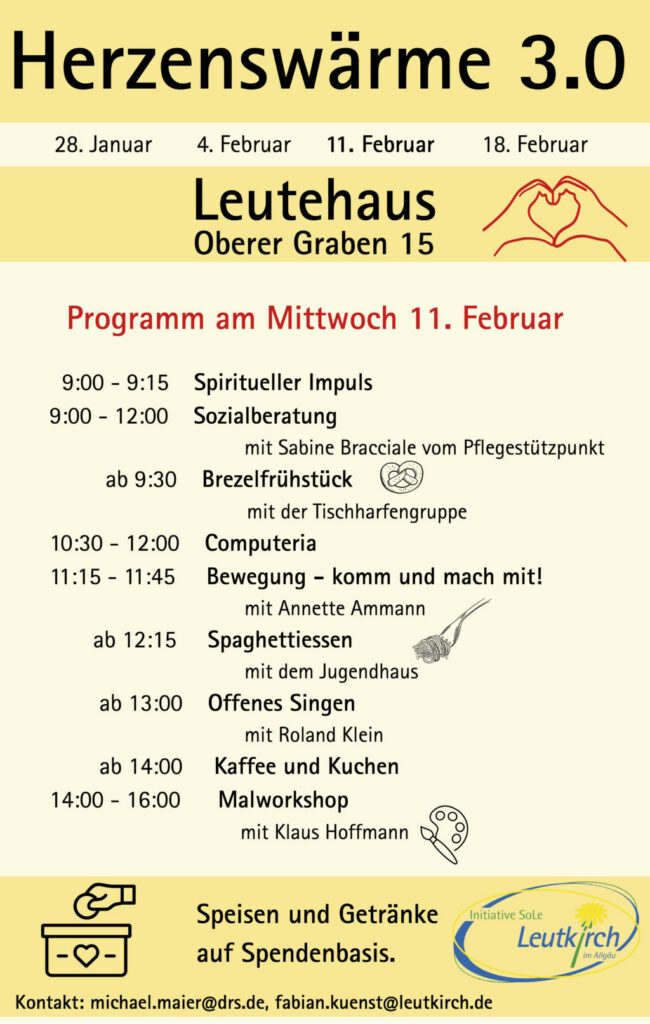 Leutkirch – Am kommenden Mittwoch, 11. Februar geht es weiter im Projekt Herzenswärme 3.0 im Leutehaus. Die Aktion geht noch bis zum Aschermittwoch mit verschiedenen Angeboten. Details finden Sie in den Schaukästen. Herzliche Einladung dazu!
