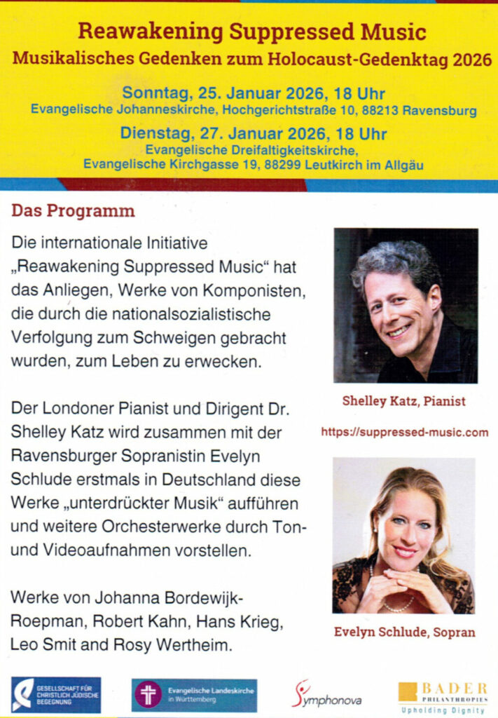 Der Londoner Pianist und Dirigent Dr. Shelley Katz wird zusammen mit der Ravensburger Sopranistin Evelyn Schlude erstmals in Deutschland diese „unterdrückte Musik“ aufführen. Das erste Konzert findet am Sonntag, 25. Januar, 18.00 Uhr in der Ev. Johanneskirche Ravensburg (Hochgerichtsstraße 10) statt. Das zweite Konzert am Dienstag, 27. Januar, 18.00 Uhr in der Ev. Dreifaltigkeitskirche in Leutkirch (Evangelische Kirchgasse 19). In beiden Konzerten wird Dr. Shelley Katz auch über den Hintergrund der aufgeführten Werke informieren. Der Eintritt ist frei.