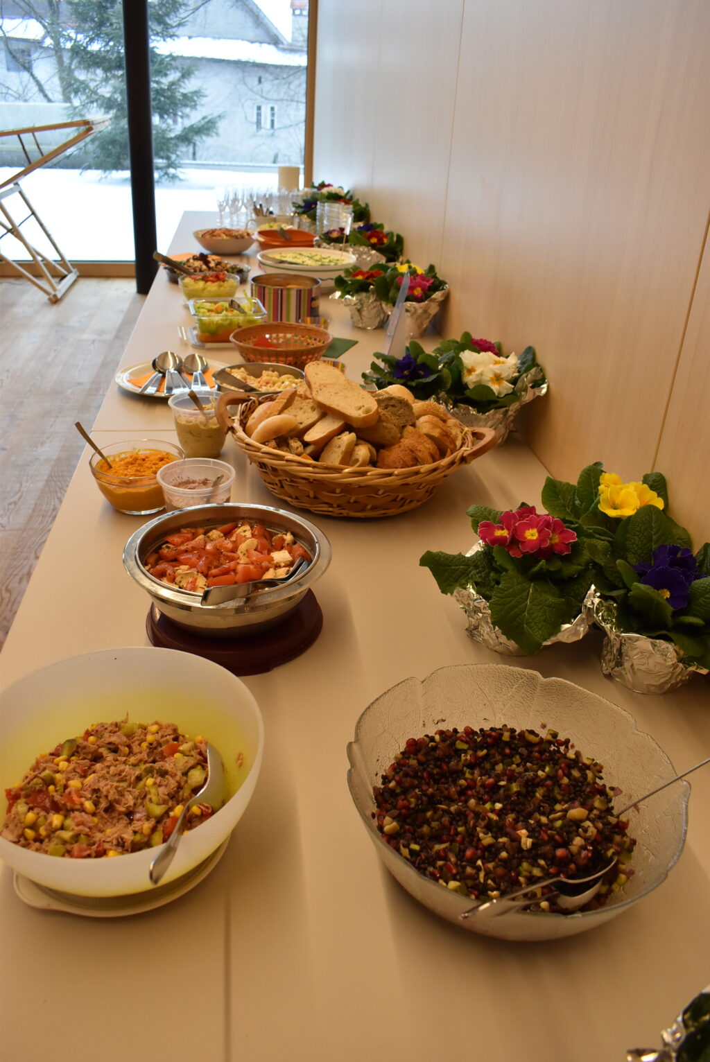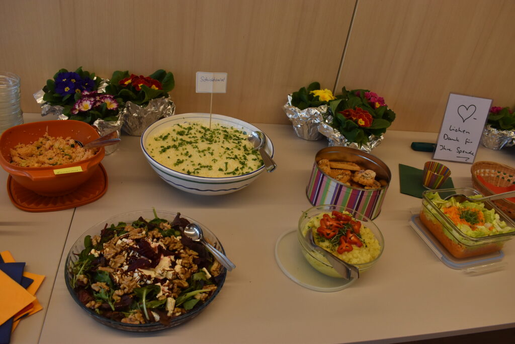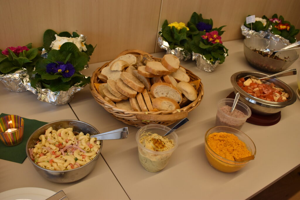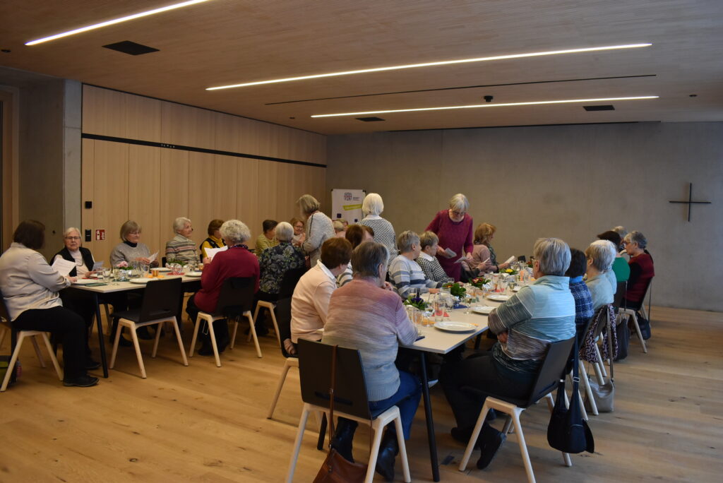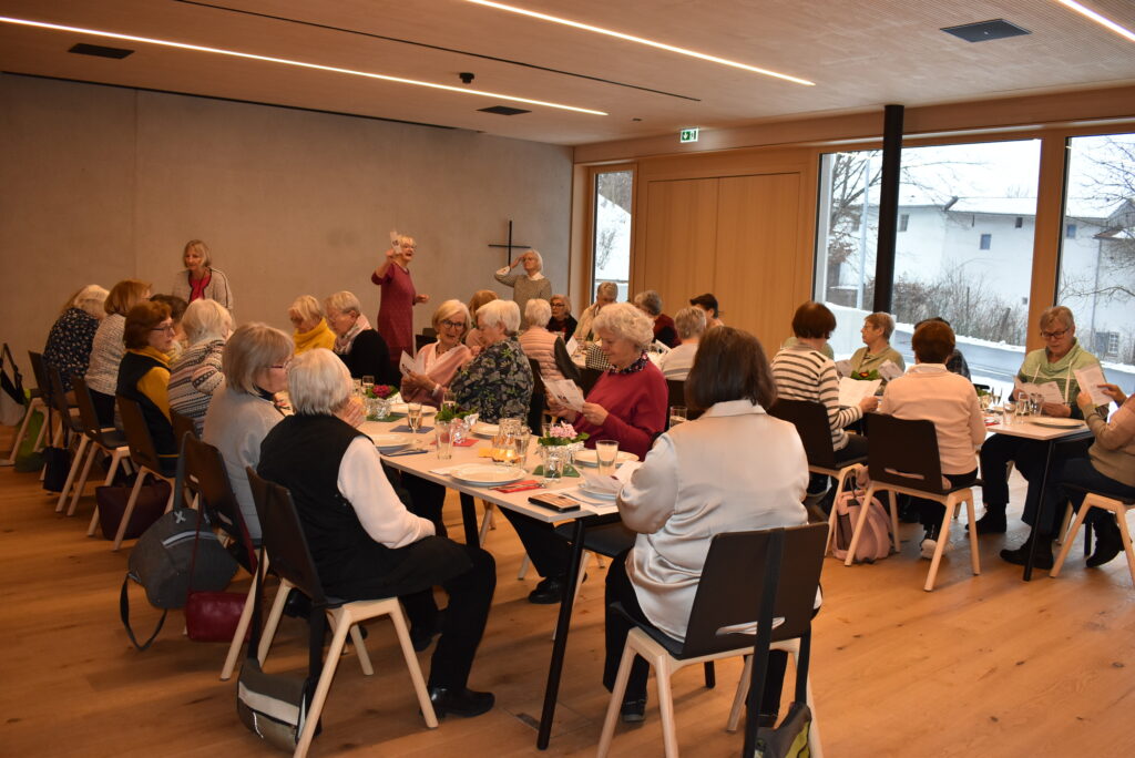 Dann wurde das reichhaltige Salatbüffet gestürmt, das alles bot, was das Herz begehrt. Gestärkt ging es weiter im Programm. Es wurde gesungen und gerätselt mit spannenden Fragen zum Frauenbund, zur Kirchengemeinde und zum Allgemeinwissen. Süße Preise wurden verteilt und nochmals zur Freude aller gesungen. Zum Schluss sprach Adelheid Rauch-Mangold einen Segen und wünschte allen ein frohes, gutes, gesundes Neues Jahr. Alle Frauen erhielten eine Frühlings-Primel sowie einen Text „Jahressegen“. Es war eine sehr gemütliche, stimmige Feier zum Jahresanfang.