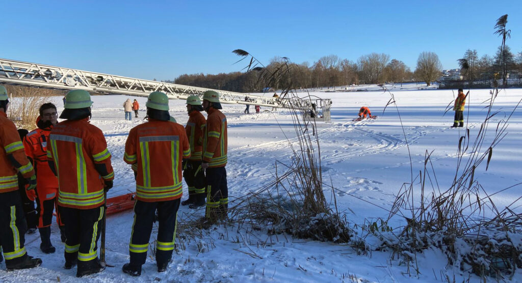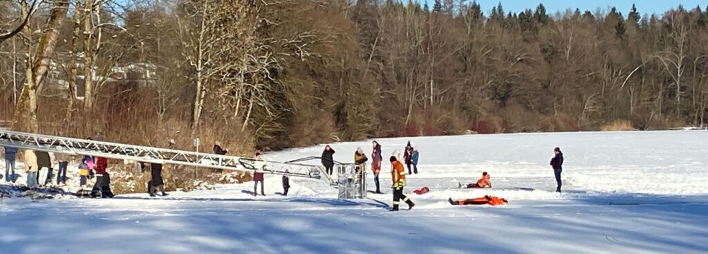 Die Feuerwehr Leutkirch nutzte am vergangen Sonntag (4.1.) die Frostperiode, um eine Eisrettungsübung durchzuführen. Kommandant Martin Waizenegger warnt: „Frost und Kälte lassen derzeit an vielen Stellen Weiher und Seen, zum Teil sogar Bäche und Flüsse zufrieren.“ Da und dort würden diese Eisflächen von Schlittschuhläufern, Spaziergängern oder Kinder zum Spielen genutzt. „Jedoch bergen diese Eisflächen erhebliche Gefahren. Die Tragfähigkeit der Eisdecke ist schwer einzuschätzen, und sie kann über das Gewässer hinweg variieren.“ Häufig seien sich Kinder des Risikos nicht bewusst.