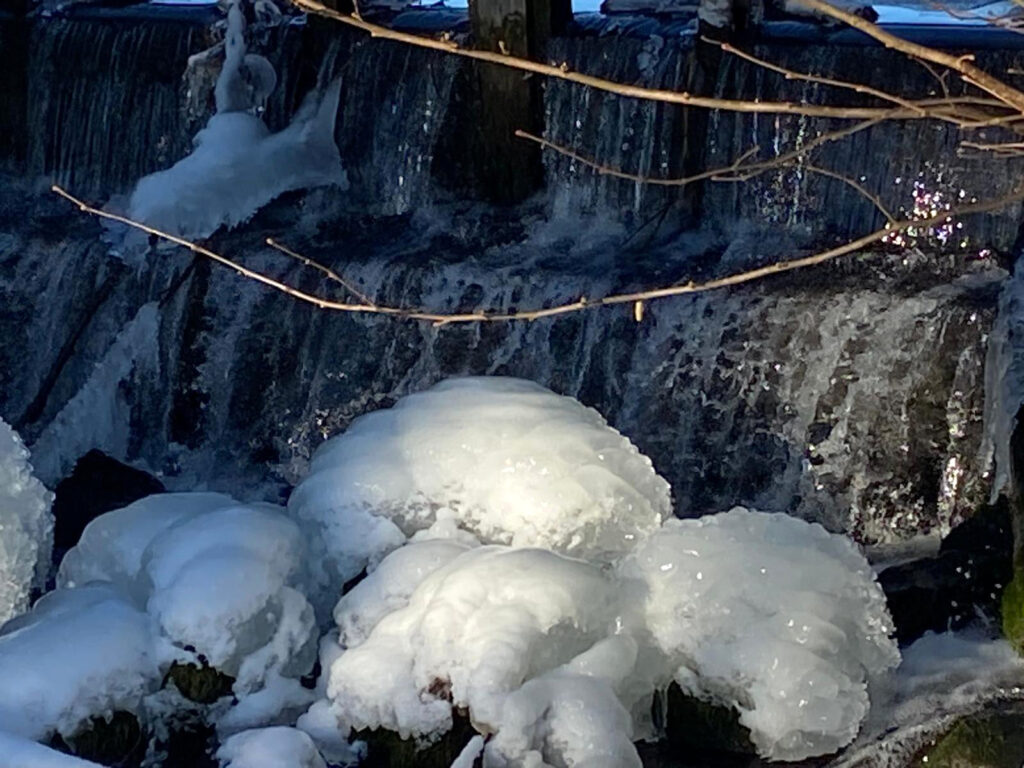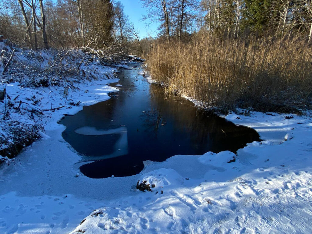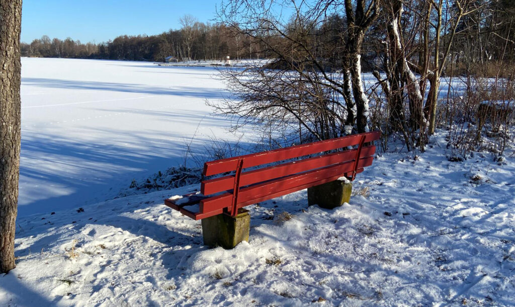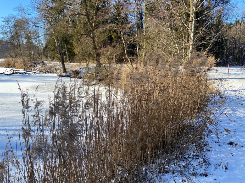 „Betreten des Stadtweihers verboten“. So steht’s unmissverständlich auf dem Schild am Uferdamm des Sees. Vorsicht ist geboten. Das gefrorene Wasser und viele bemerkenswerte Uferbereiche sind auch von den offiziellen, geräumten Gehwegen um den Stadweiher aus zu betrachten. Teils mit Ski-Loipe. Darüberhinaus finden sich geschichtliche Zeitzeuginnen – wie die Moosmühle am Bach-Zulauf des Weihers. Dort verraten Infotafeln etwas über den Bau.