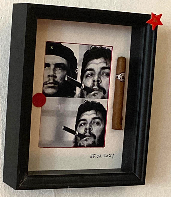 Was ist eigentlich „Upcycle“? Der „Entsorgungsbeauftragte“ einer Abfallbehörde würde das wohl als „Wertstoff“ bezeichnen. Andere nennen’s schlicht „Müll“. Gehört dazu auch eine Zigarre? Dieser rauchige Genussgegenstand befindet sich im Rahmen solch einer „Installation“ von Monika Titelius jetzt im „drops“. Neben einem Foto von Che Guevara. Also jenem südamerikanischen Revolutionär (1928 – 1967), dessen Porträt in den 1960er/1970er-Jahren in vielen Jugendzimmern wie ein Heiligenbild hing. Von Ché Guevaras Lieblings-Zigarrenmarke befindet sich ein Original-Stengel in der gerahmten Darstellung Monika Titelius – seit dem 2. Januar im „drops“ zu bewundern. Ebenso wie einige gebrauchte T-Shirts, die Titelius kunstvoll eingerahmt hat. „Sieht super aus“, meinten einige Urlauber aus Krefeld.