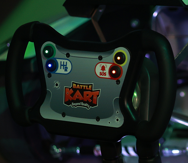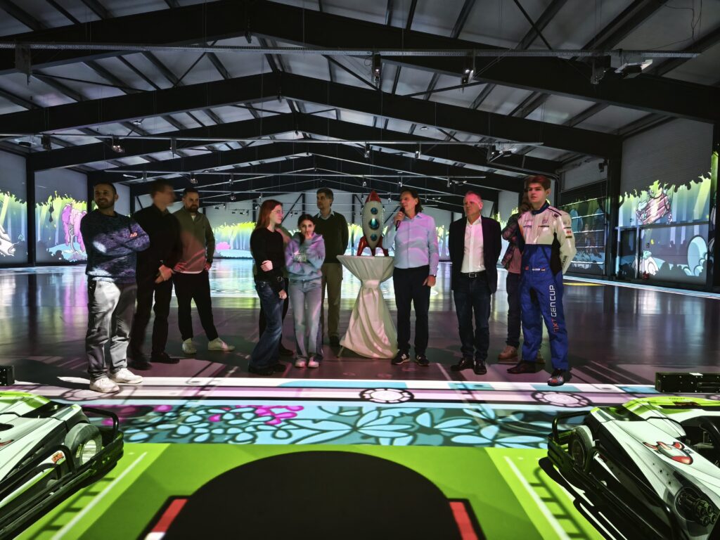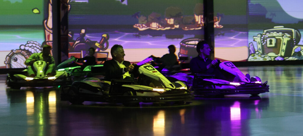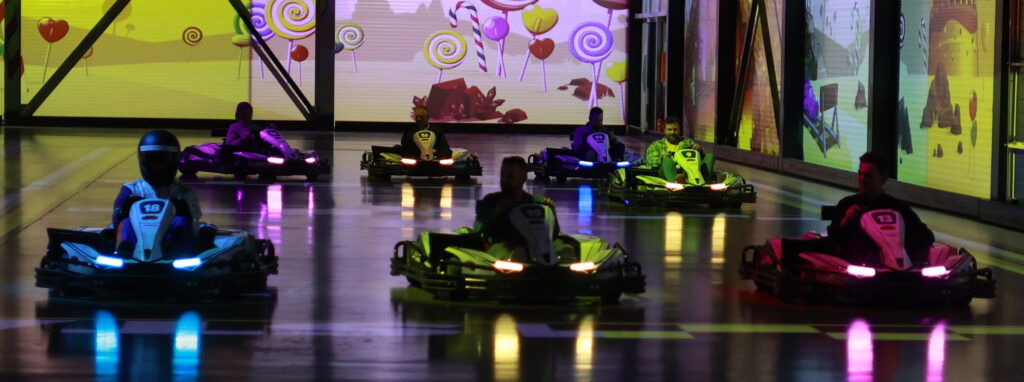 In der Halle in der Nadlerstraße verschmelzen Rennfeeling und Videospielatmosphäre: Die Karts fahren elektrisch, lokal emissionsfrei und fast lautlos, während die Soundanlage das passende „Wummern“ dazu liefert. Über 70 Beamer zaubern eine virtuelle Rennstrecke auf den blanken Hallenboden, Leuchtpfeile und interaktive Elemente machen jede Runde zu einem neuen Spielerlebnis. Je nach gewähltem Modus sammeln die Fahrer Punkte, lösen Aufgaben und sehen ihre Ergebnisse direkt auf dem Bildschirm.