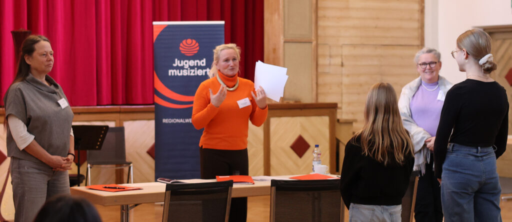 Die Jury bespricht mit zwei Harfenistinnen deren Vortrag.
