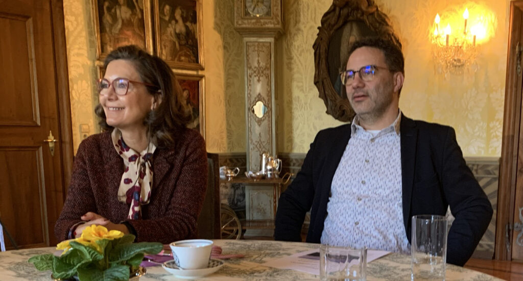 Bei strahlendem Sonnenschein fand das Pressegespräch im Repräsentanzbereich des Renaissanceschlosses statt. Bereits im Innenhof des Schlosses wurde man von einem sehr freundlichen Mitarbeiter des Hauses in Livree empfangen und in den prunkvollen Veranstaltungsraum geführt. Herrliche Stuckdecke, eine historische Standuhr, ein klassischer Kachelofen, ein Kunstwerk an der Wand, das Musizierende zeigt und ein mit bunten Primeln geschmückter Konferenztisch waren das besondere Ambiente des anstehenden Informationsgesprächs. Erfreut begrüßte die Fürstin die Anwesenden sehr herzlich und lud sie zu Kaffee, Tee und Brezeln ein. Unter den Gästen waren neben Pressevertretern Anna Rauschardt, Pressereferentin der Wolfegger Konzerte vom Münchner Büro PR Alliance, und Peter Müller, Bürgermeister der Gemeinde, sowie Sascha Binoth, Geschäftsführer des Bad Waldseer Fürstlichen Golf Resorts, der das geplante Konzert in den sehr weit reichenden sozialen Netzwerken des Golf Resorts bewerben wird. Die Geschäftsführerin der Wolfegger Konzerte Susanne Hölzer war per Video zugeschaltet. Manfred Honeck, seit 30 Jahren künstlerischer Leiter der Konzerte und gleichzeitig Musikdirektor des Pittsburgh Symphony Orchestra (USA), erläuterte ebenfalls per Livezuschaltung – aus Bamberg – Ideen und Hintergründe des geplanten Programms. Trotz weltweiter Konzertverpflichtungen dürfe in seiner Terminplanung Wolfegg niemals fehlen, betonte er, denn in diesen besonderen Räumlichkeiten und bei den dort besonders konzertfreundlichen Menschen fühle er sich auf beste Weise angenommen. Auch das diesjährige Konzert werde sich aus Kammermusik, großer Symphonik und geistlicher Vokalmusik zusammensetzen.